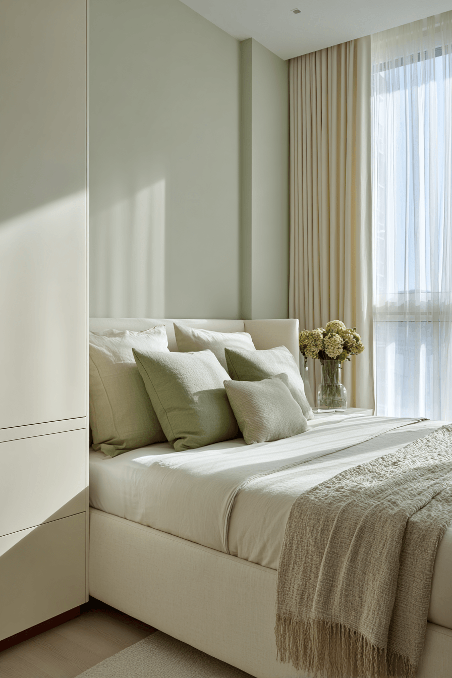 If simplicity is your thing, this approach keeps everything clean and intentional. A sage green and cream bedroom works beautifully with minimal styling because both tones feel soft and uncluttered. Cream furniture paired with subtle sage accents lets the color palette shine without needing extra decor. Keeping surfaces tidy while adding just a bit of texture creates warmth and balance. The result feels fresh, light, and effortlessly put together. Embrace this minimalist style and simplify your space beautifully.