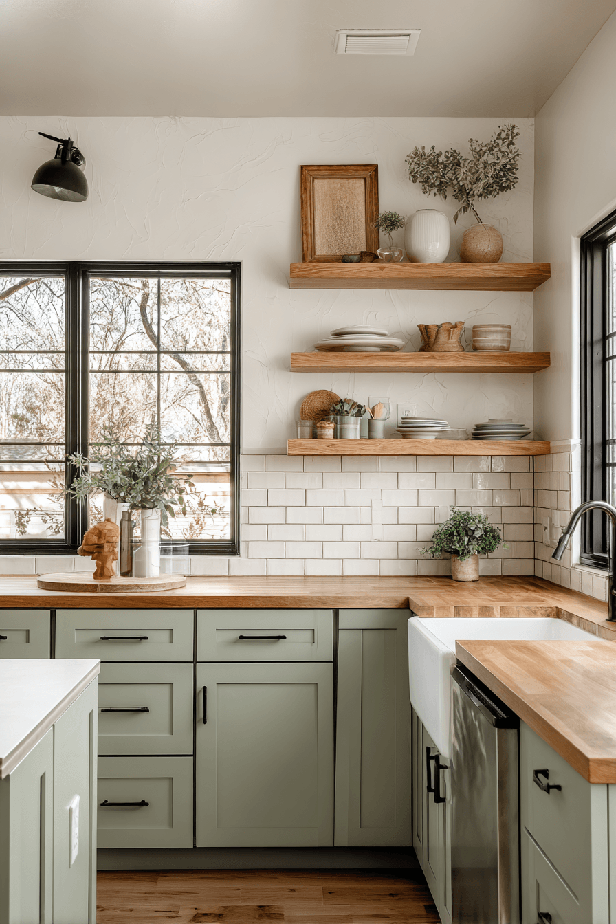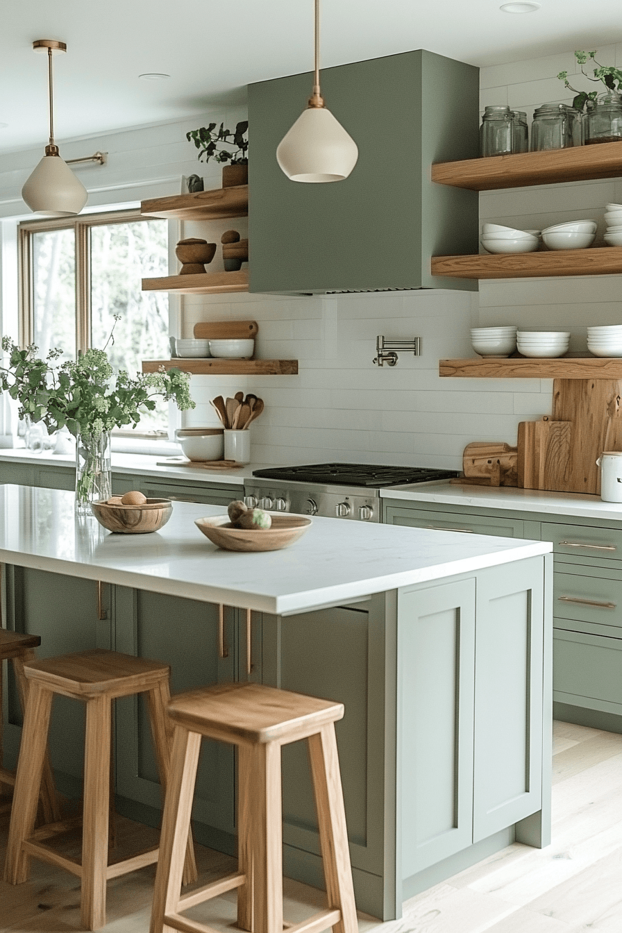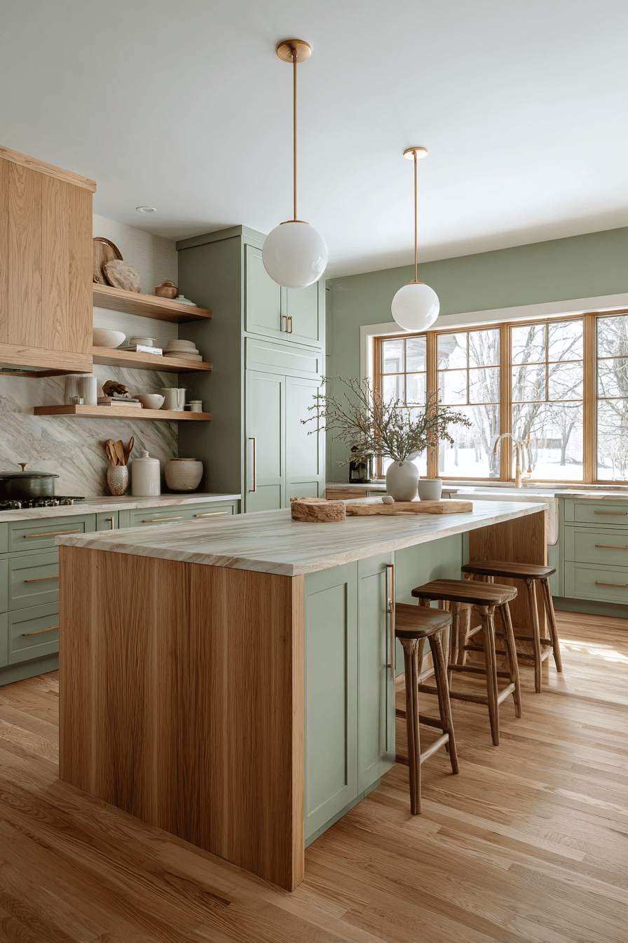 Using wood as an accent allows a sage green and wood kitchen to feel clean and intentional. Let sage cabinetry take the spotlight while adding wood through shelves, stools, or a butcher block surface. These subtle touches bring warmth without overwhelming the design. This approach works especially well in smaller or minimalist spaces. The result is fresh, balanced, and highly adaptable. See how small wood accents can transform your kitchen effortlessly.