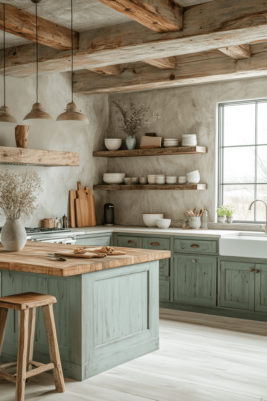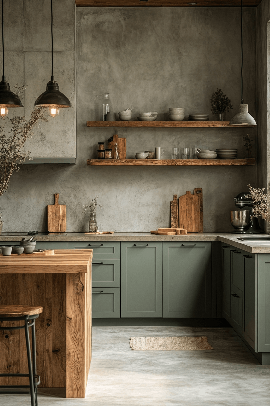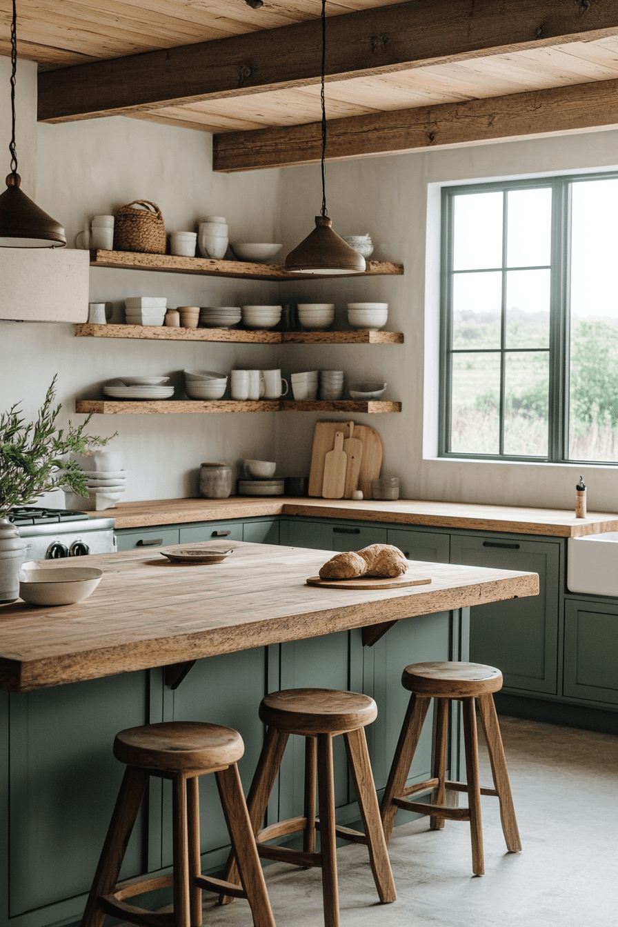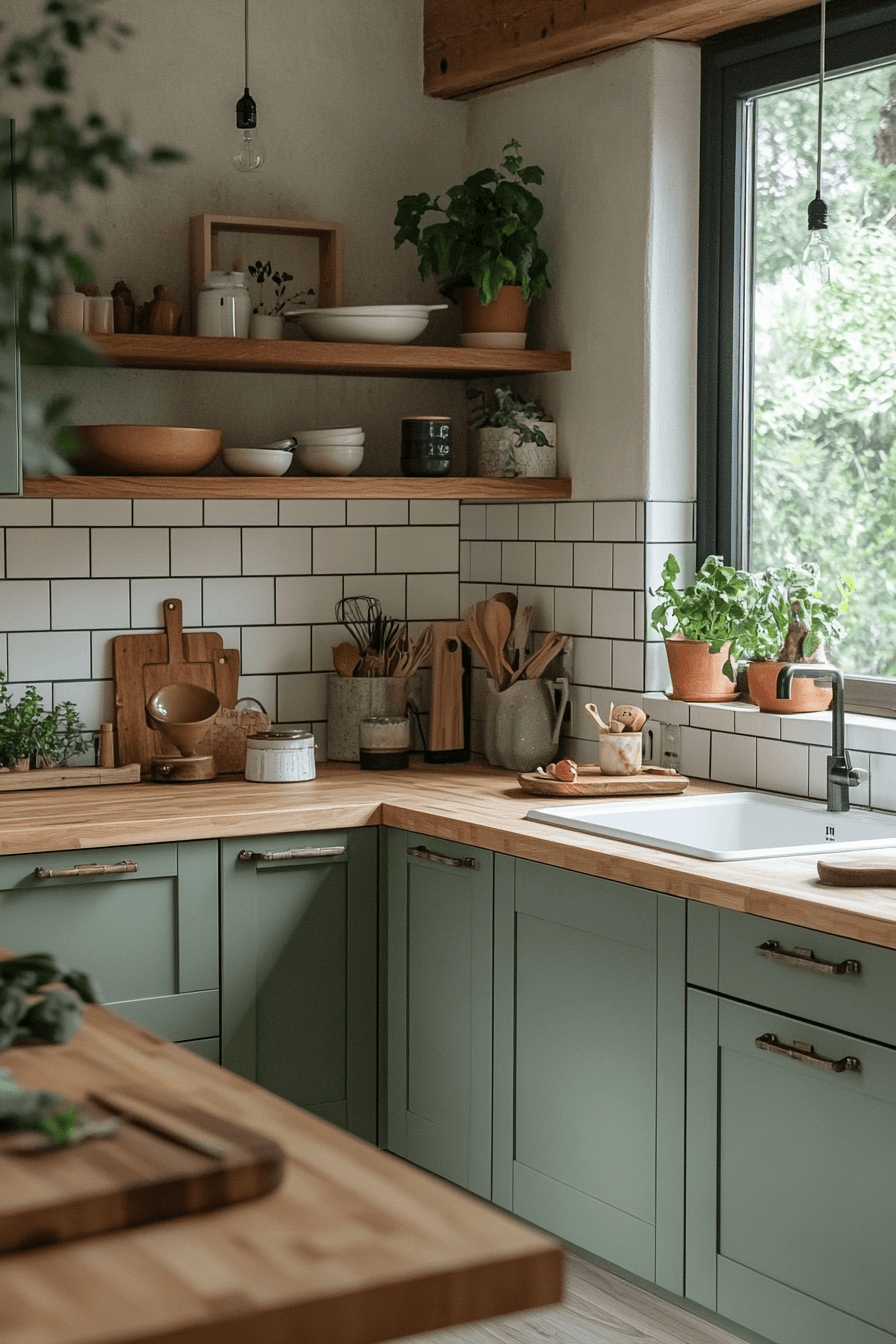 Using wood as an accent allows a sage green and wood kitchen to feel clean and intentional. Let sage cabinetry take the spotlight while adding wood through shelves, stools, or a butcher block surface. These subtle touches bring warmth without overwhelming the design. This approach works especially well in smaller or minimalist spaces. The result is fresh, balanced, and highly adaptable. See how small wood accents can transform your kitchen effortlessly.