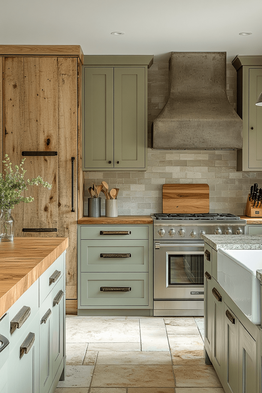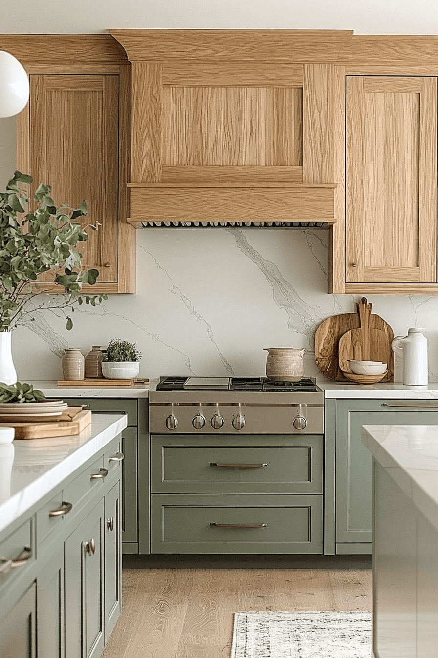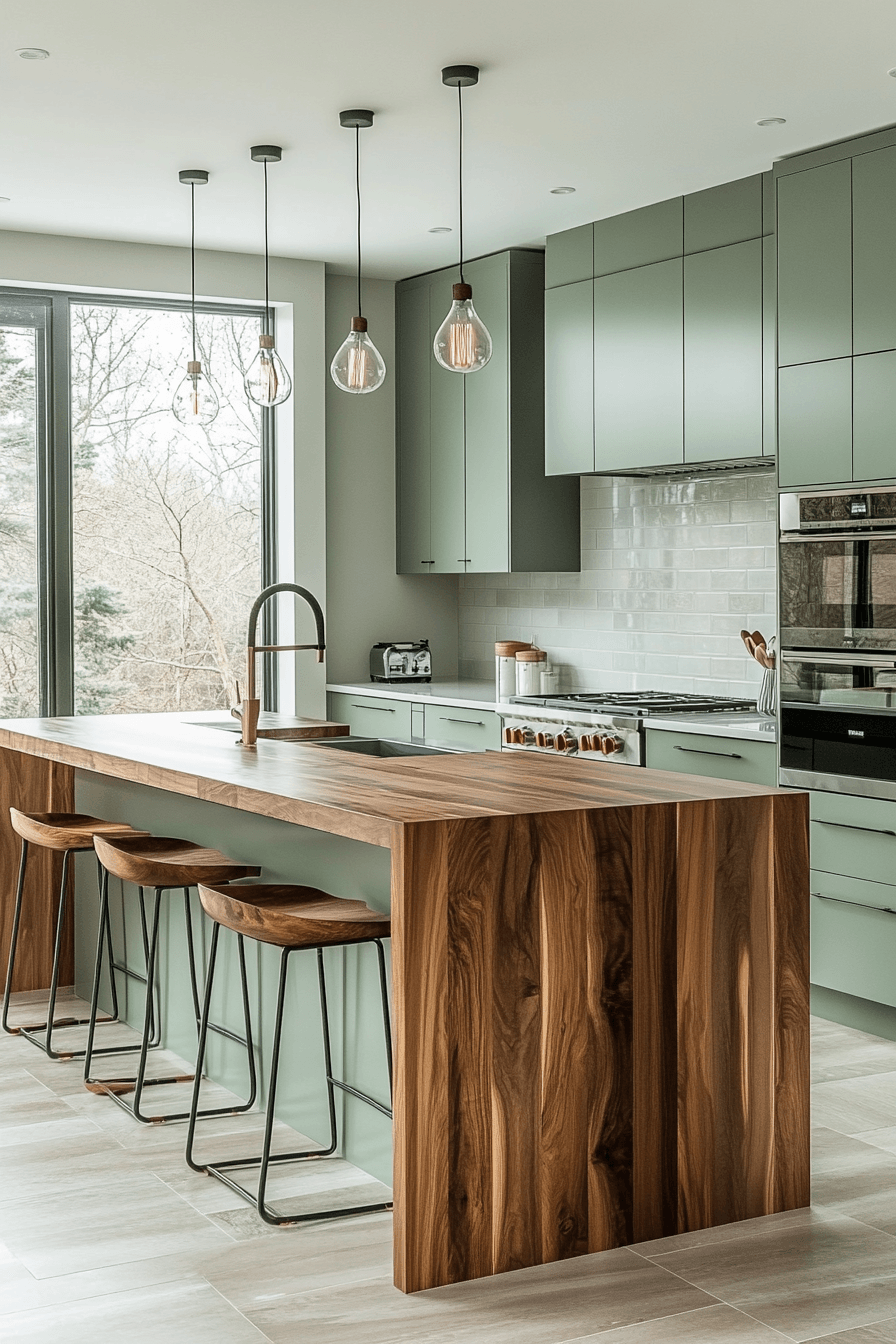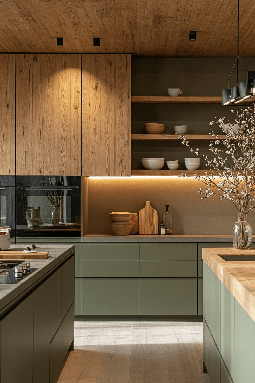 A sage green and wood kitchen can feel incredibly refined when every detail is thoughtfully designed. Sleek sage drawers with ultra-thin handles—or even push-to-open features—create a clean, modern edge. Pairing these with flat wood panels adds a sophisticated, almost editorial feel. Linear lighting enhances the structure and keeps the look intentional. The entire space feels sharp, minimal, and visually balanced. Refine your kitchen with this clean, architectural approach.