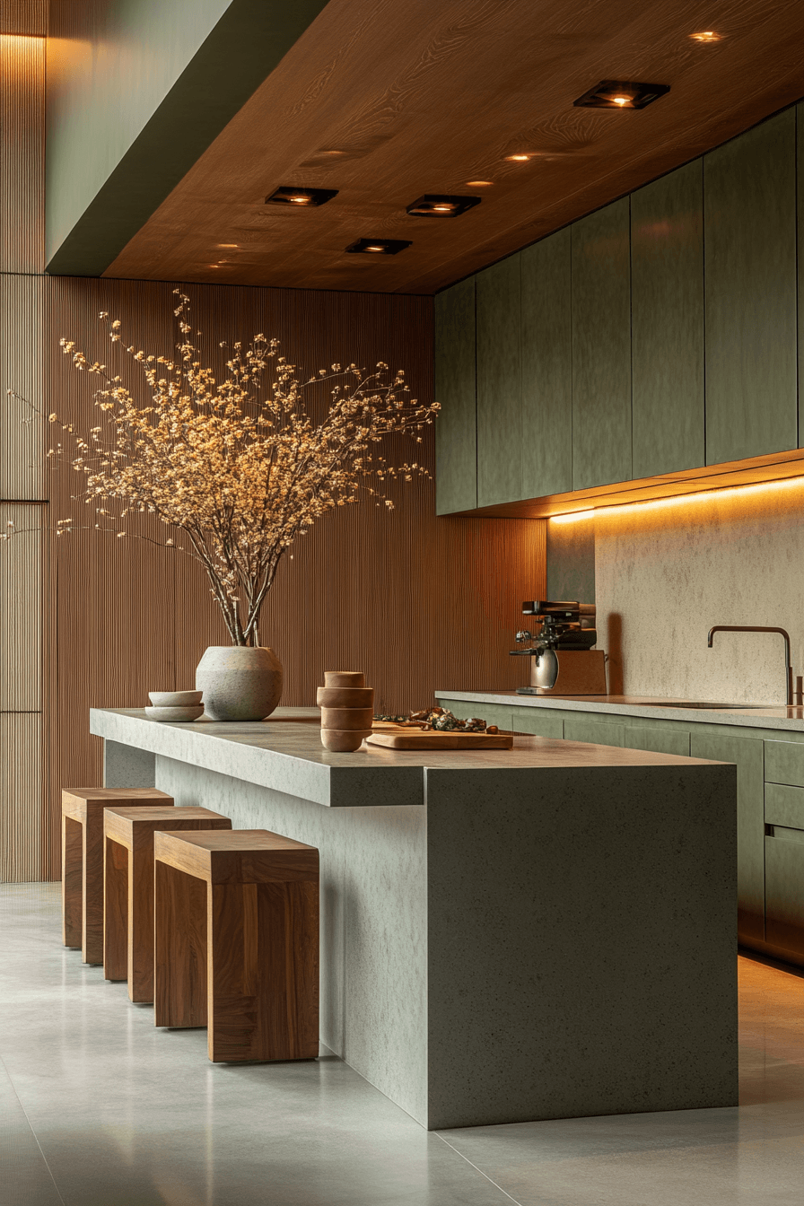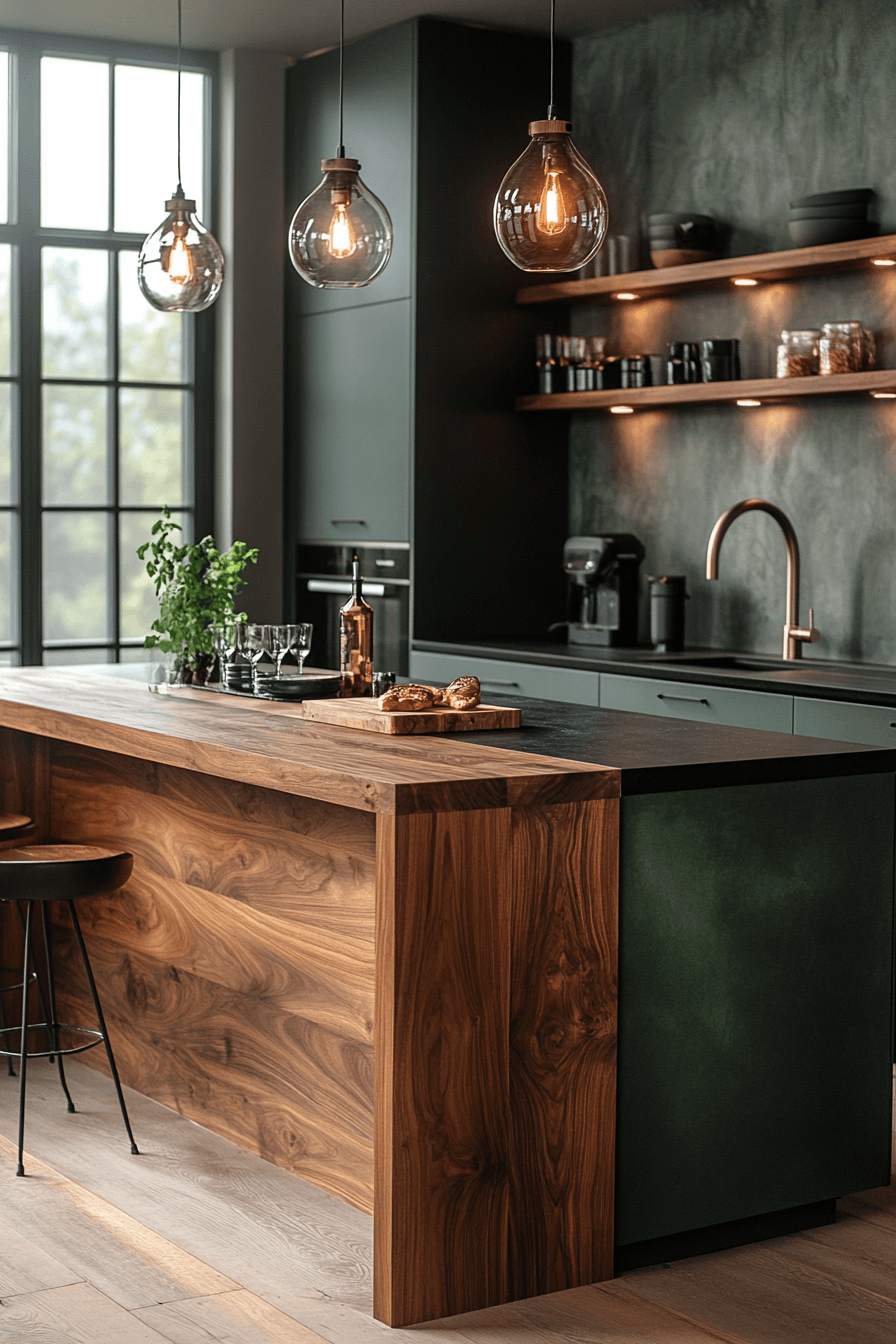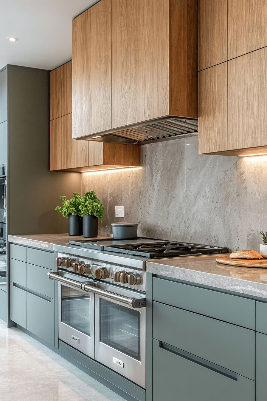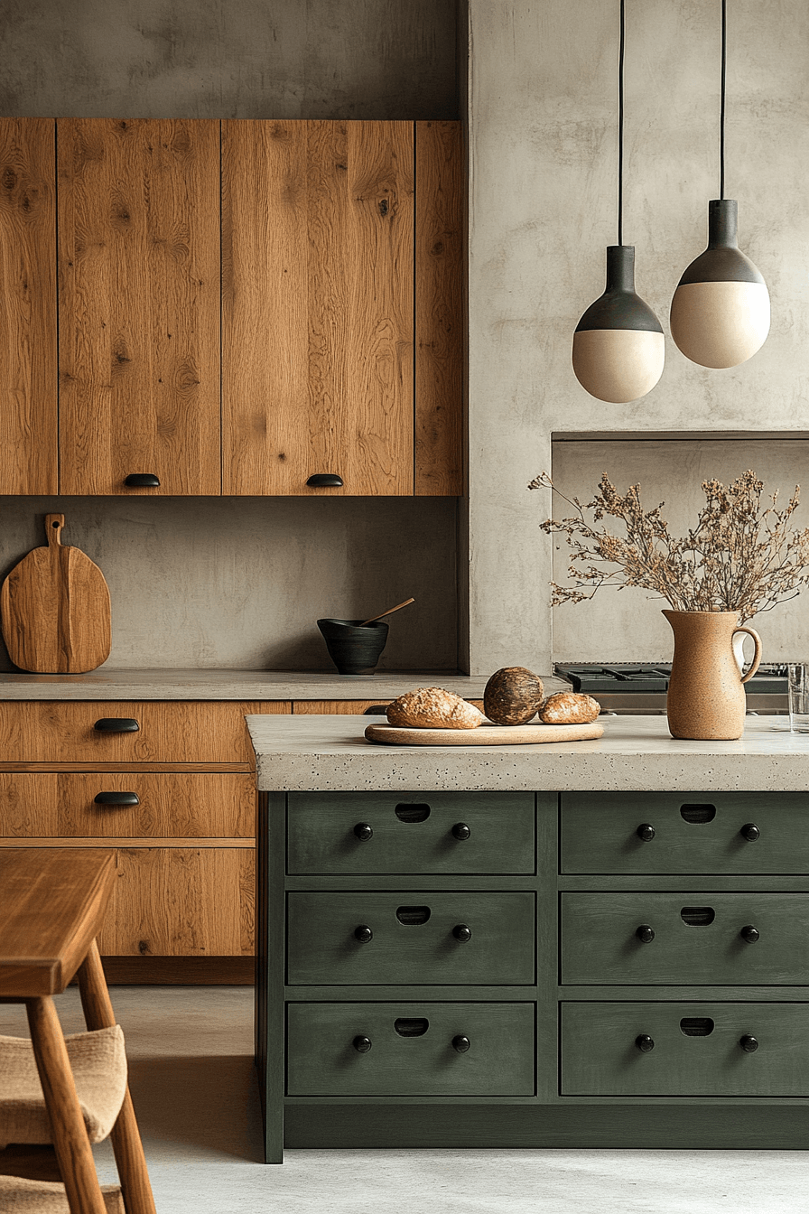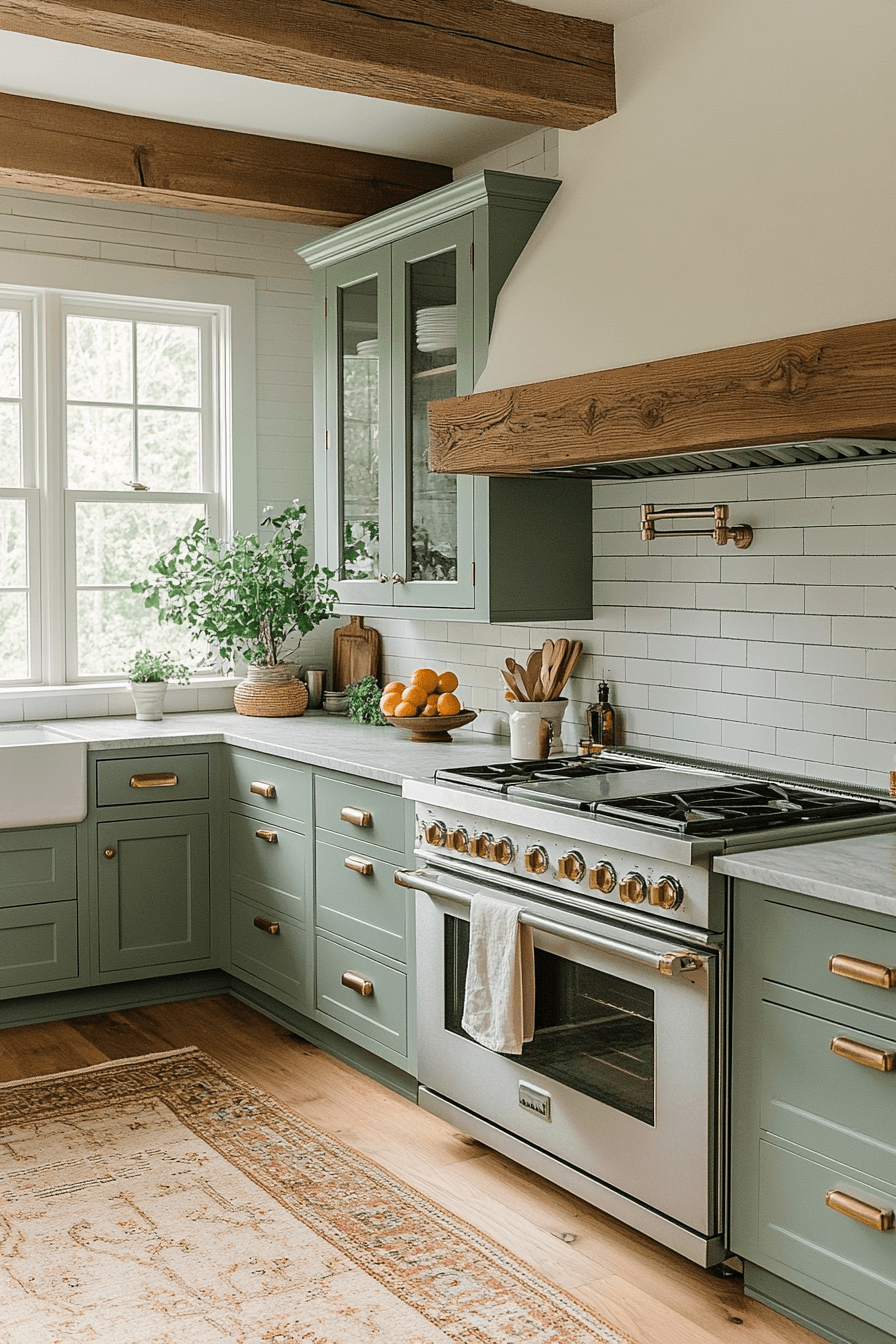 A sage green and wood kitchen can feel incredibly refined when every detail is thoughtfully designed. Sleek sage drawers with ultra-thin handles—or even push-to-open features—create a clean, modern edge. Pairing these with flat wood panels adds a sophisticated, almost editorial feel. Linear lighting enhances the structure and keeps the look intentional. The entire space feels sharp, minimal, and visually balanced. Refine your kitchen with this clean, architectural approach.