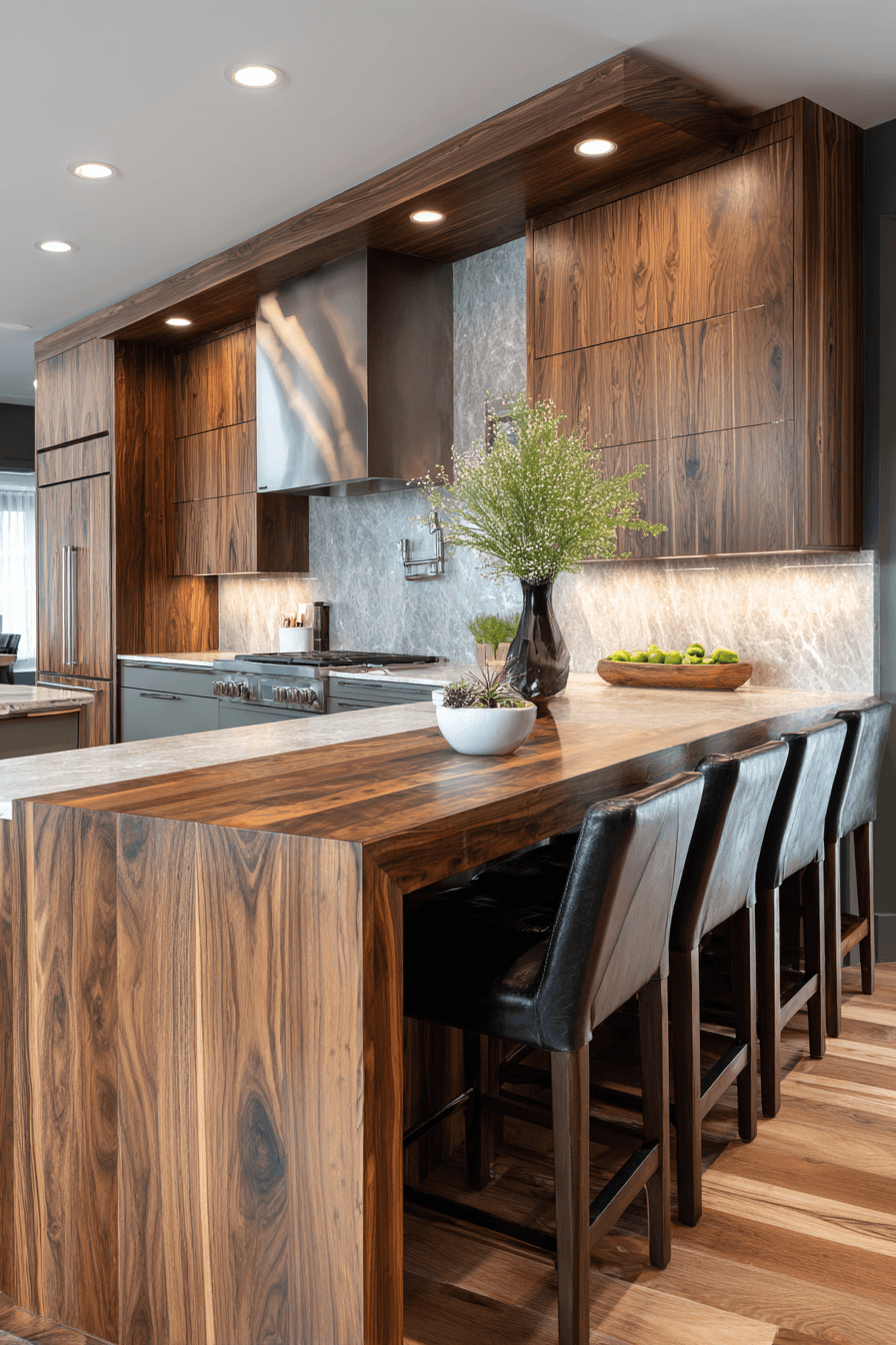 Darker wood tones can add richness and depth to a sage green and wood kitchen. Walnut finishes, for example, create a striking contrast against soft sage cabinetry. Using darker wood on an island or shelving helps draw the eye and add visual interest. The combination feels bold yet balanced, blending warmth with sophistication. It’s perfect for those who want a more dramatic but still inviting space. Experience this rich pairing and elevate your kitchen design.
