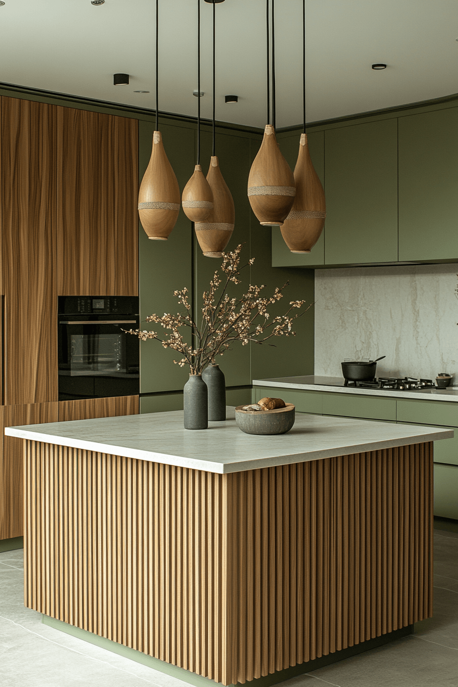 Introducing slatted wood details brings movement and depth to a sage green and wood kitchen. Vertical wood slats on an island or cabinet fronts pair beautifully with soft sage tones. The design feels clean yet visually interesting, adding a touch of architectural detail. Sleek hardware and hidden storage keep everything looking polished. The result is a custom, thoughtfully designed space. Try this textured approach and give your kitchen a unique upgrade.