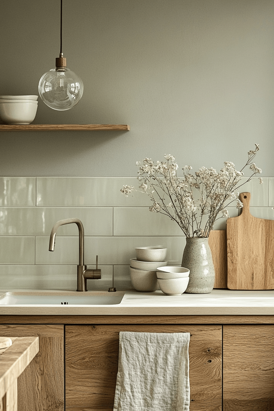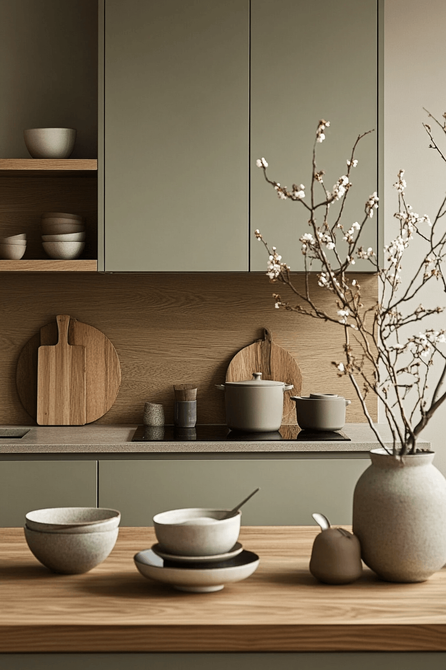Blending warmth with simplicity, a sage green and wood kitchen can feel both relaxed and modern. Using wood as the dominant material across cabinets or flooring, with sage as a subtle accent, creates a balanced look. Minimal hardware or push-to-open drawers keep the design sleek. Adding soft textures like linen or matte ceramics brings depth without clutter. The result feels cozy yet effortlessly refined. Master this warm minimalist style and transform your kitchen.
