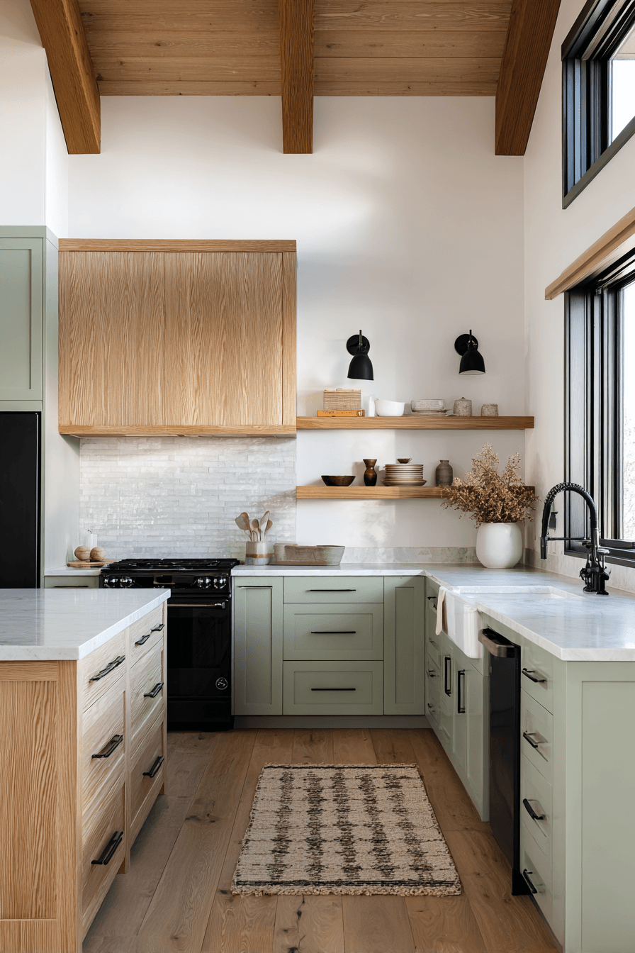 A sage green and wood kitchen feels refined and modern when built around clean lines and simple forms. Flat-front cabinetry, slim handles, and smooth transitions between sage and wood elements create a seamless look. Sage adds a soft touch of color, while wood introduces warmth and structure. The uncluttered layout keeps everything functional and visually calm. It’s a perfect fit for anyone who loves a sleek, polished space. Discover how to achieve this streamlined kitchen style.