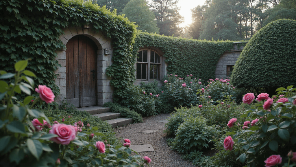 "Mystical Victorian walled garden covered in ivy with a hidden wooden door, blooming roses, and morning mist in soft dawn light creating an ethereal atmosphere."