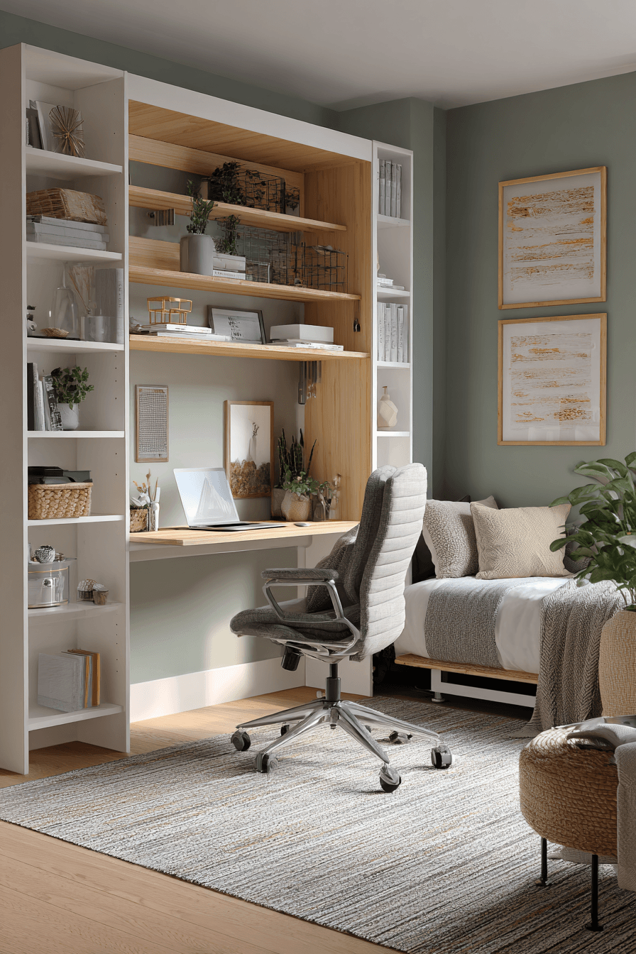 Flexibility is everything when space is limited, and clever solutions make all the difference. These small guest room ideas highlight Murphy beds that tuck away neatly to free up valuable floor space during the day. Modern designs blend seamlessly into walls or cabinetry, keeping the room stylish and uncluttered. This setup allows one space to serve multiple purposes with ease. It’s perfect for homes that need versatility without compromise. Maximize your room with a smart Murphy bed setup!