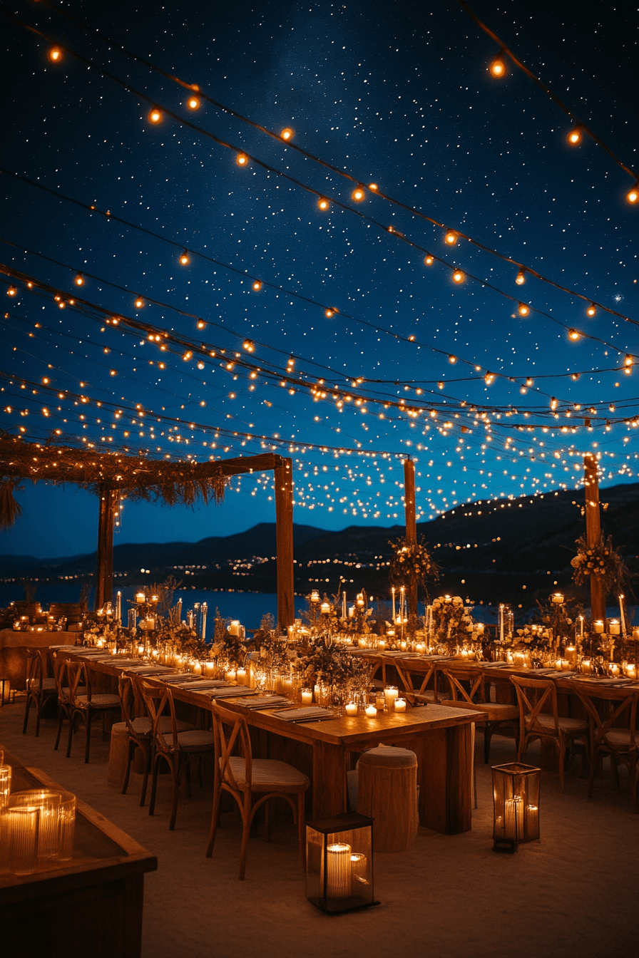 An evening celebration under the stars adds a magical and unforgettable twist to small wedding ideas. Twinkling lights, candles, and celestial-inspired decor create a dreamy nighttime atmosphere. Deep tones paired with metallic accents enhance the romantic and slightly dramatic vibe. Outdoor venues or open spaces make it easy to fully embrace the night sky as part of the experience. The result feels enchanting, intimate, and truly special. Click to explore more small wedding ideas inspired by starry nights.