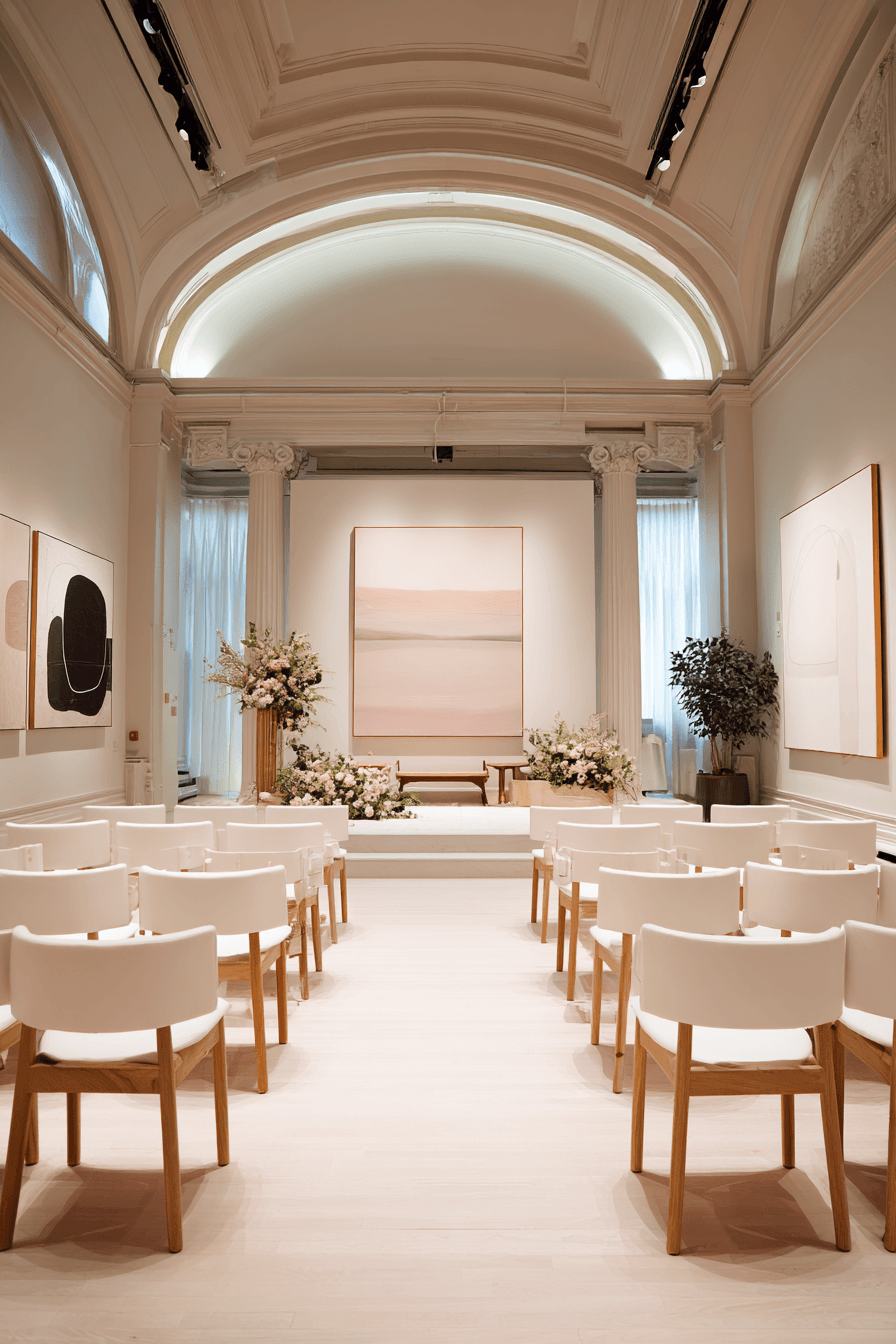 A creative venue like an art gallery brings a modern and sophisticated edge to small wedding ideas. Surrounded by unique artwork, the space naturally feels stylish and curated without needing heavy decor. Minimalist details and clean lines allow the art to take center stage while still feeling elegant. This setting is perfect for couples who appreciate creativity and contemporary design. It creates a memorable experience that feels both intimate and elevated. Tap to discover more small wedding ideas with an artistic vibe.