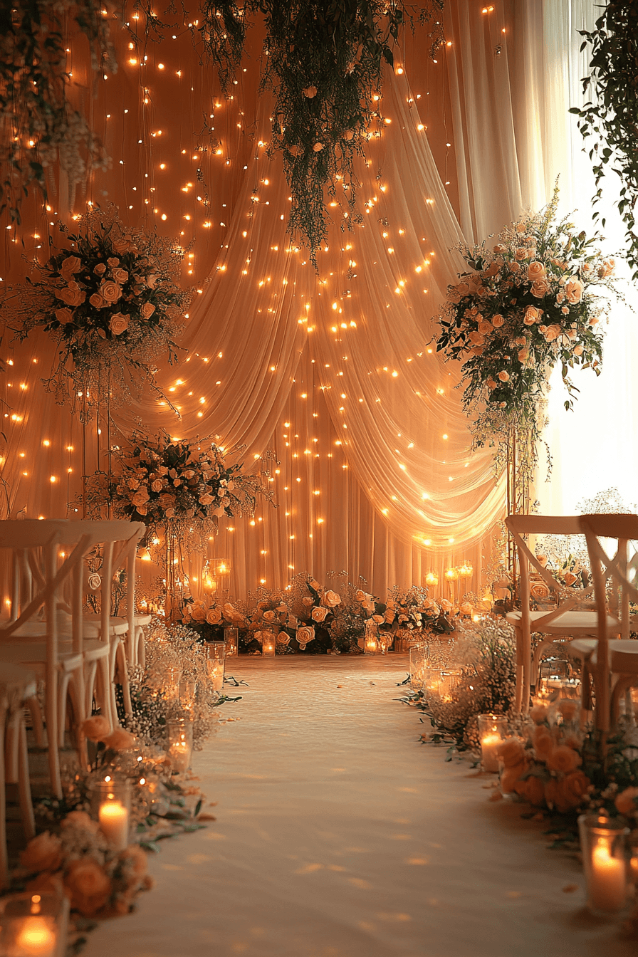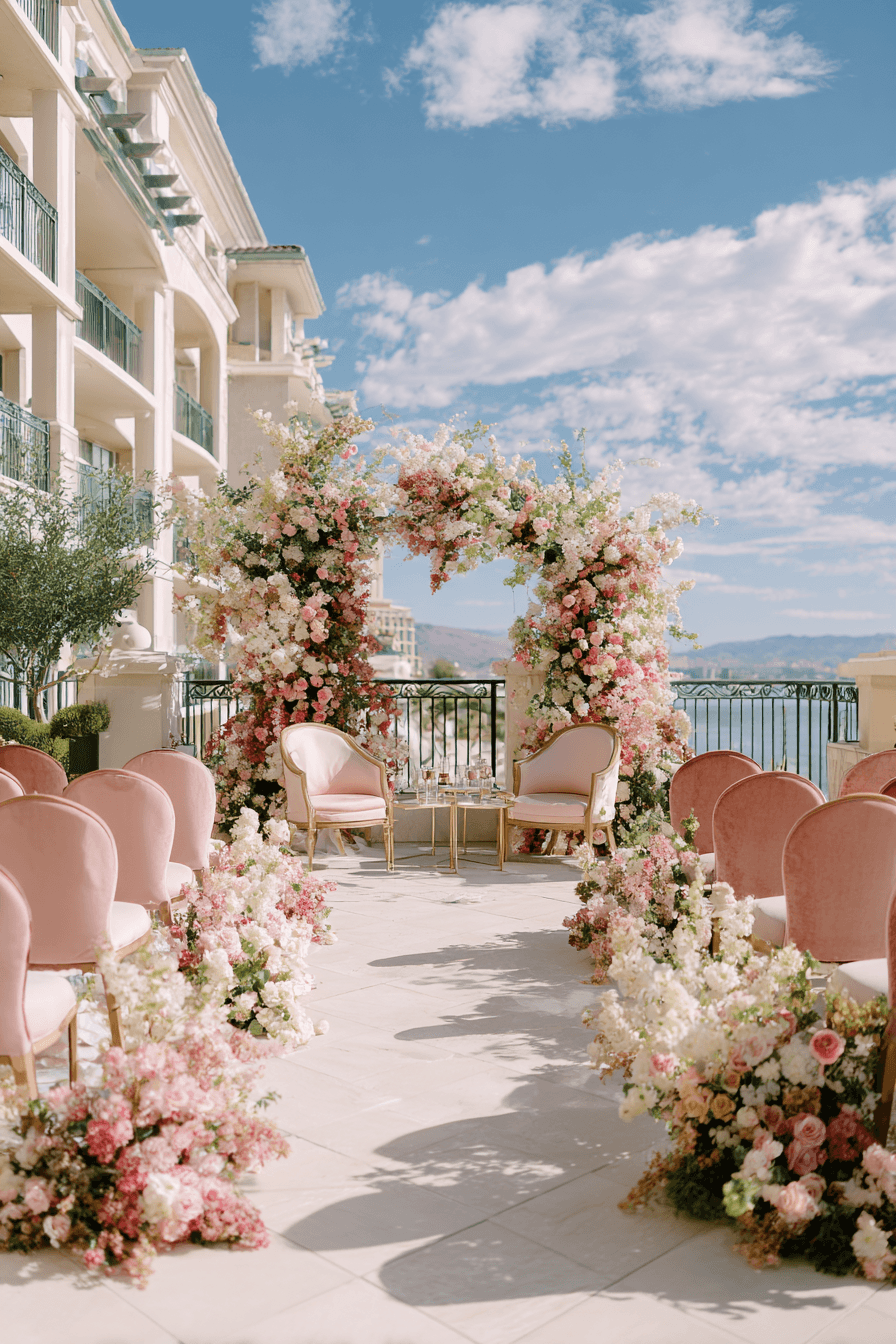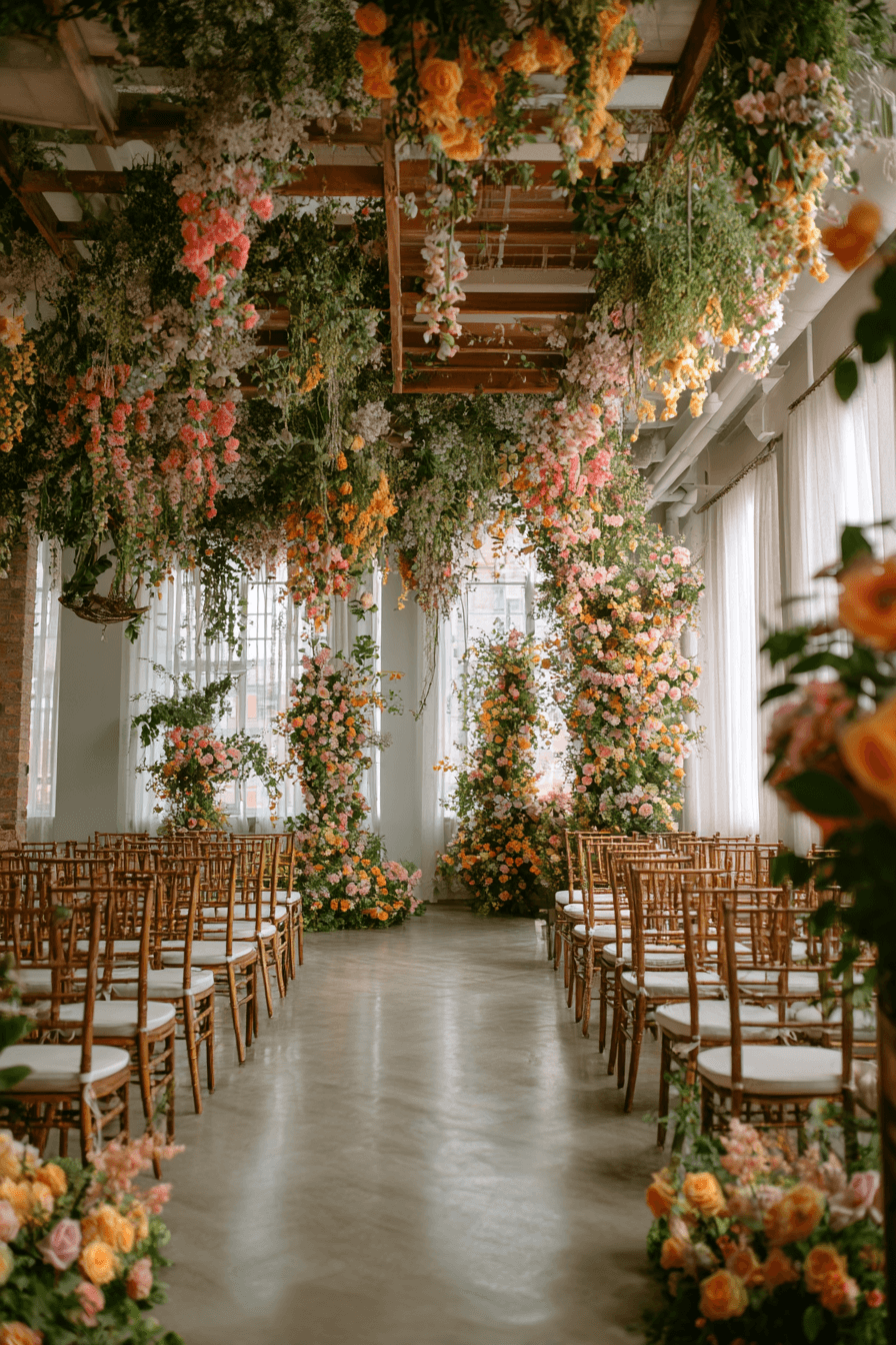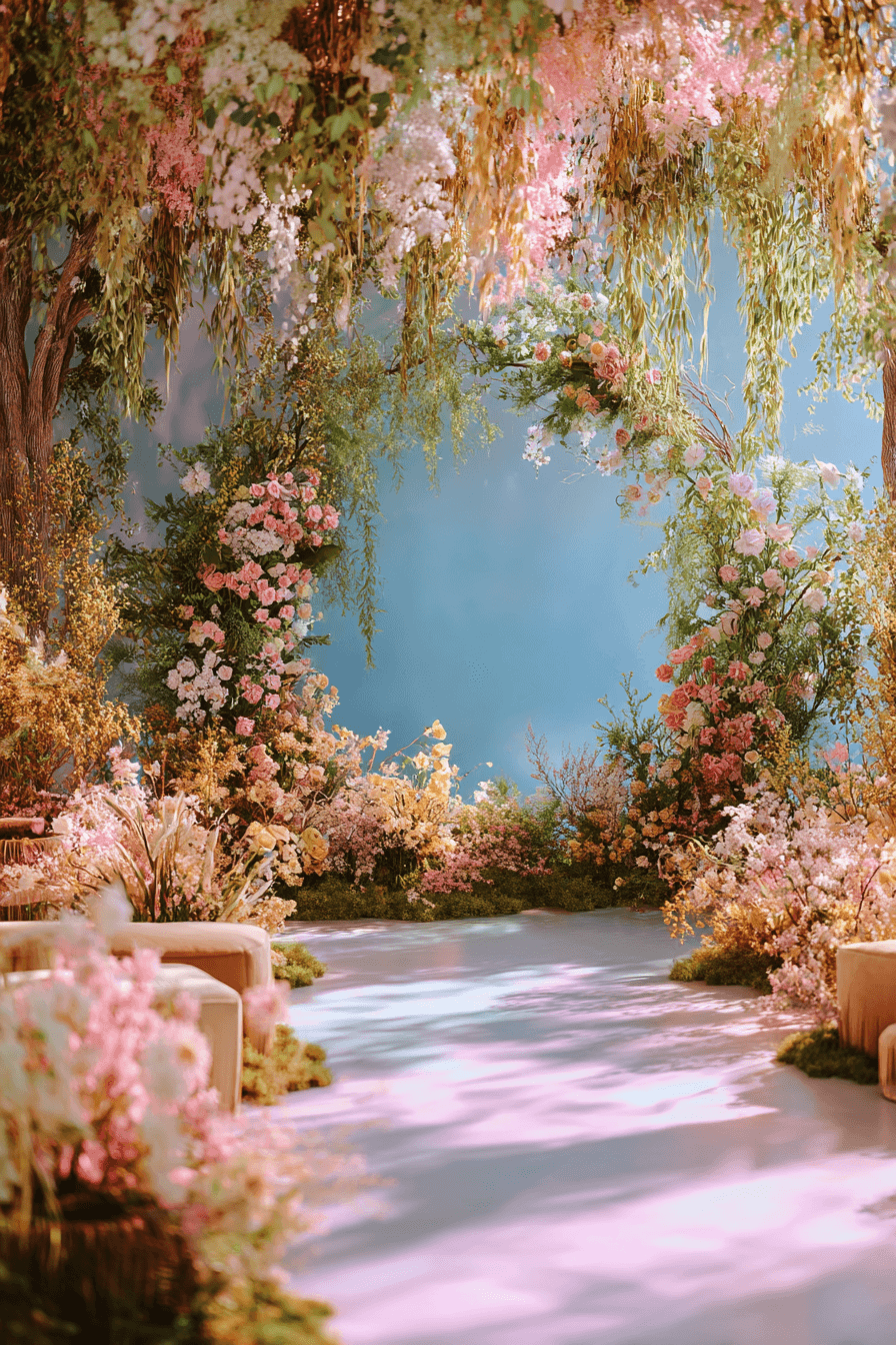 A floral-filled setting transforms small wedding ideas into a vibrant and dreamy celebration surrounded by beauty. Abundant blooms, lush greenery, and layered arrangements create a garden-like atmosphere anywhere. Flower walls, cascading centerpieces, and delicate accents bring color and life to every corner. This theme works beautifully indoors or outdoors, adapting to any space with ease. The overall feel is fresh, romantic, and full of joy. Tap to explore more small wedding ideas with a floral-inspired look.
