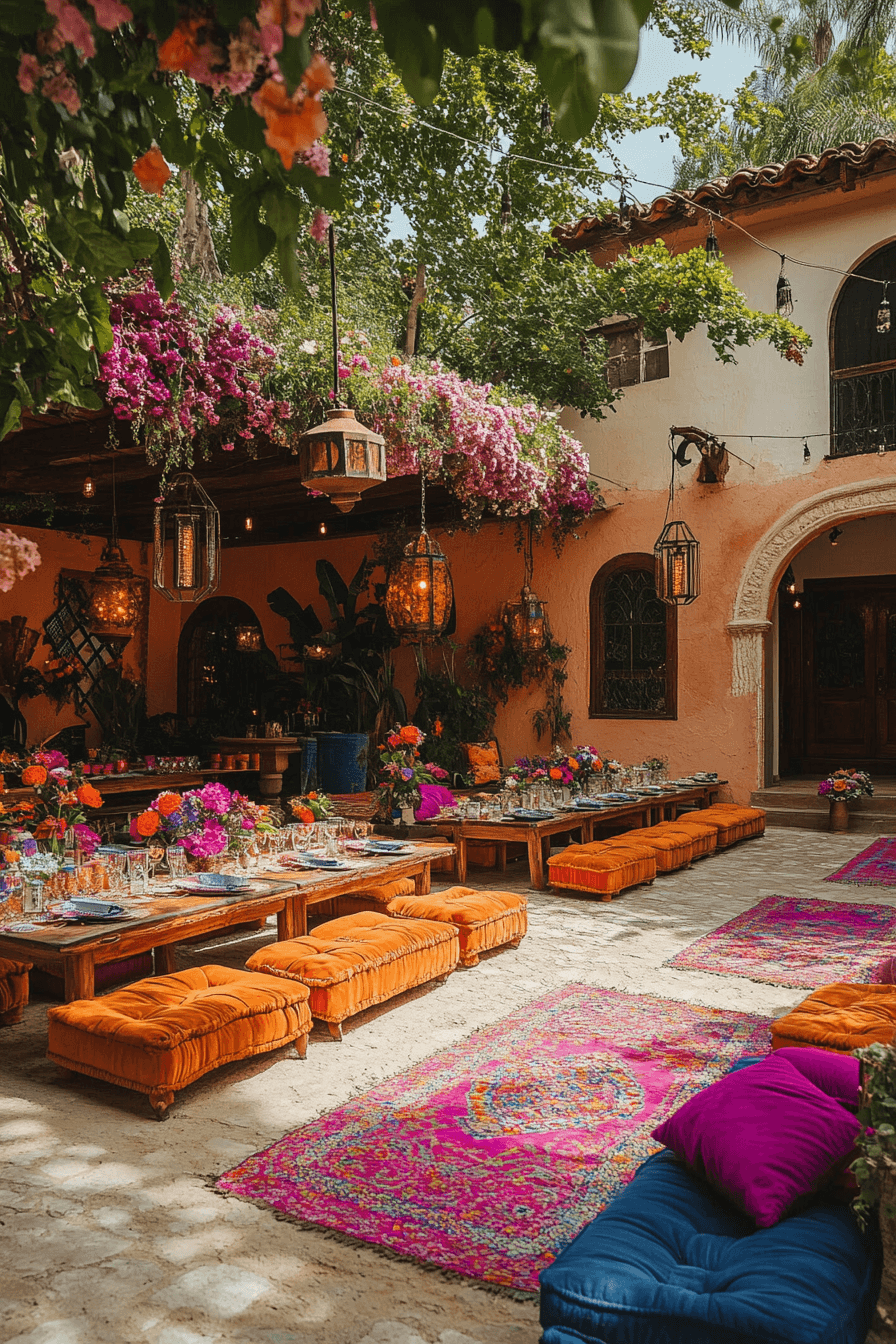 A vibrant courtyard setting brings energy and personality into small wedding ideas, creating a celebration that feels lively and full of color. Bright textiles, bold floral arrangements, and eclectic furniture pieces instantly set a festive tone. This type of space is perfect for open-air dining, relaxed seating, and a warm, social atmosphere. Incorporating string lights or lanterns enhances the ambiance as the sun sets. It’s a beautiful way to celebrate love in a cheerful, intimate environment. Tap to discover more small wedding ideas inspired by colorful courtyard vibes.
