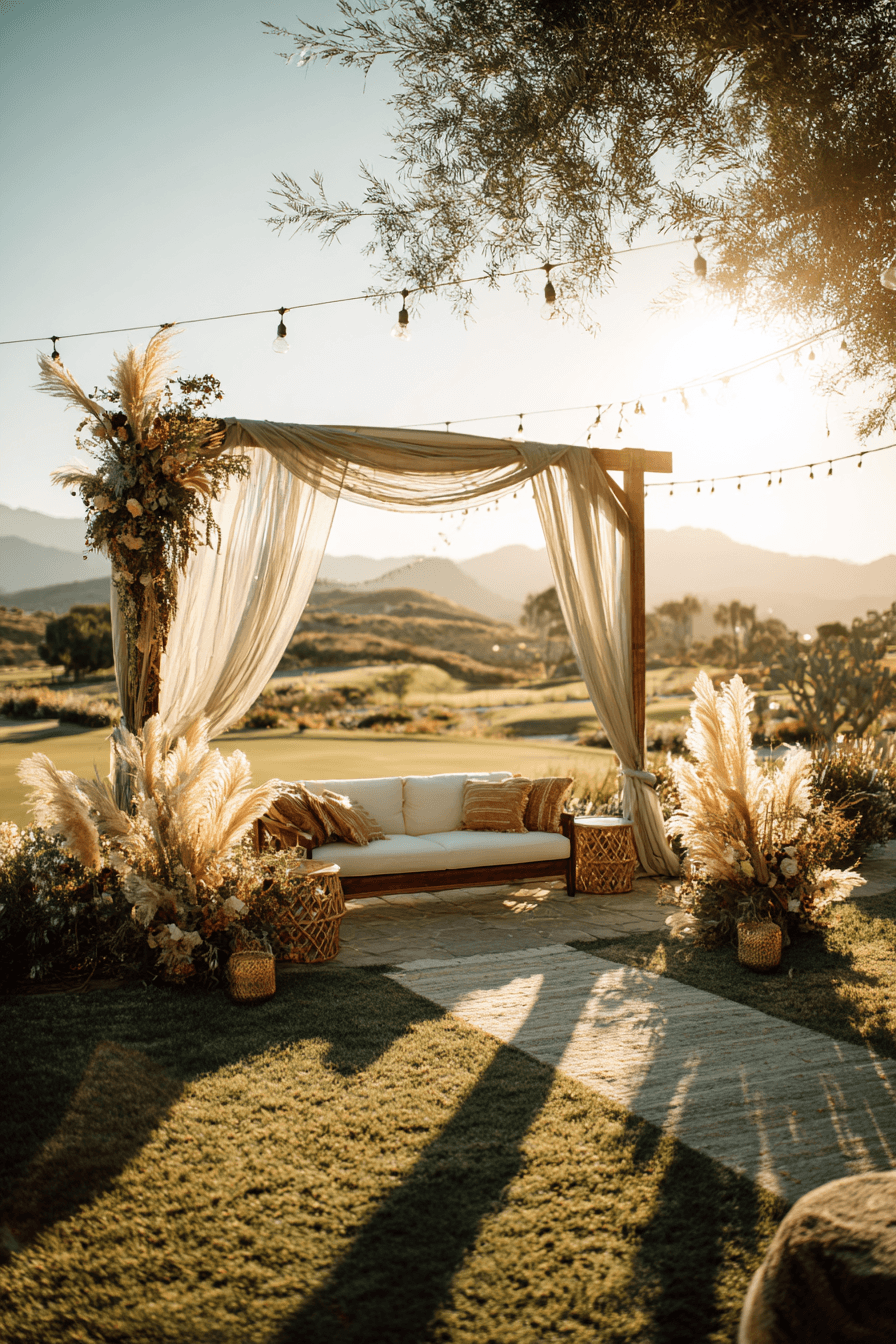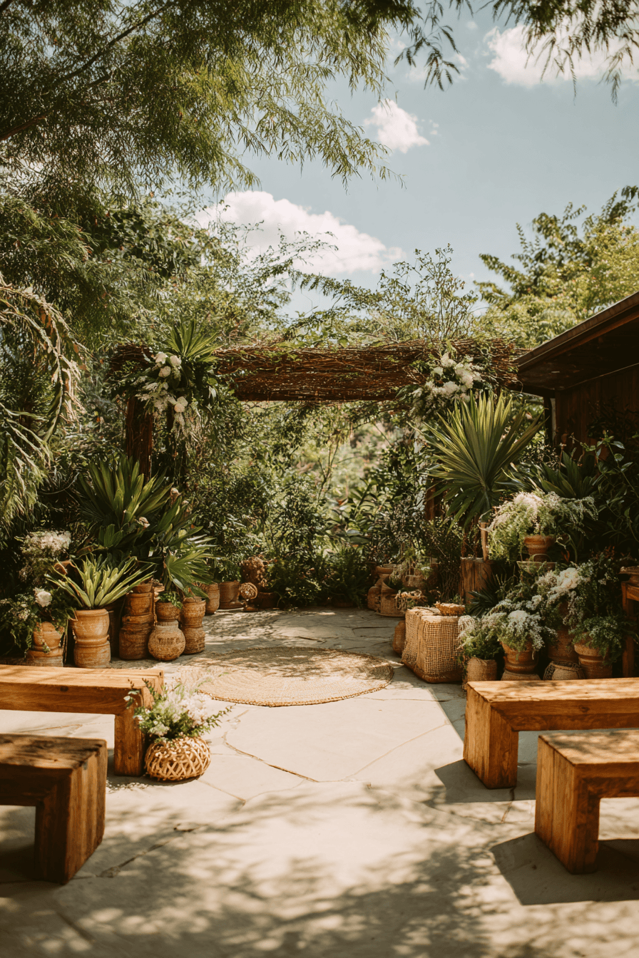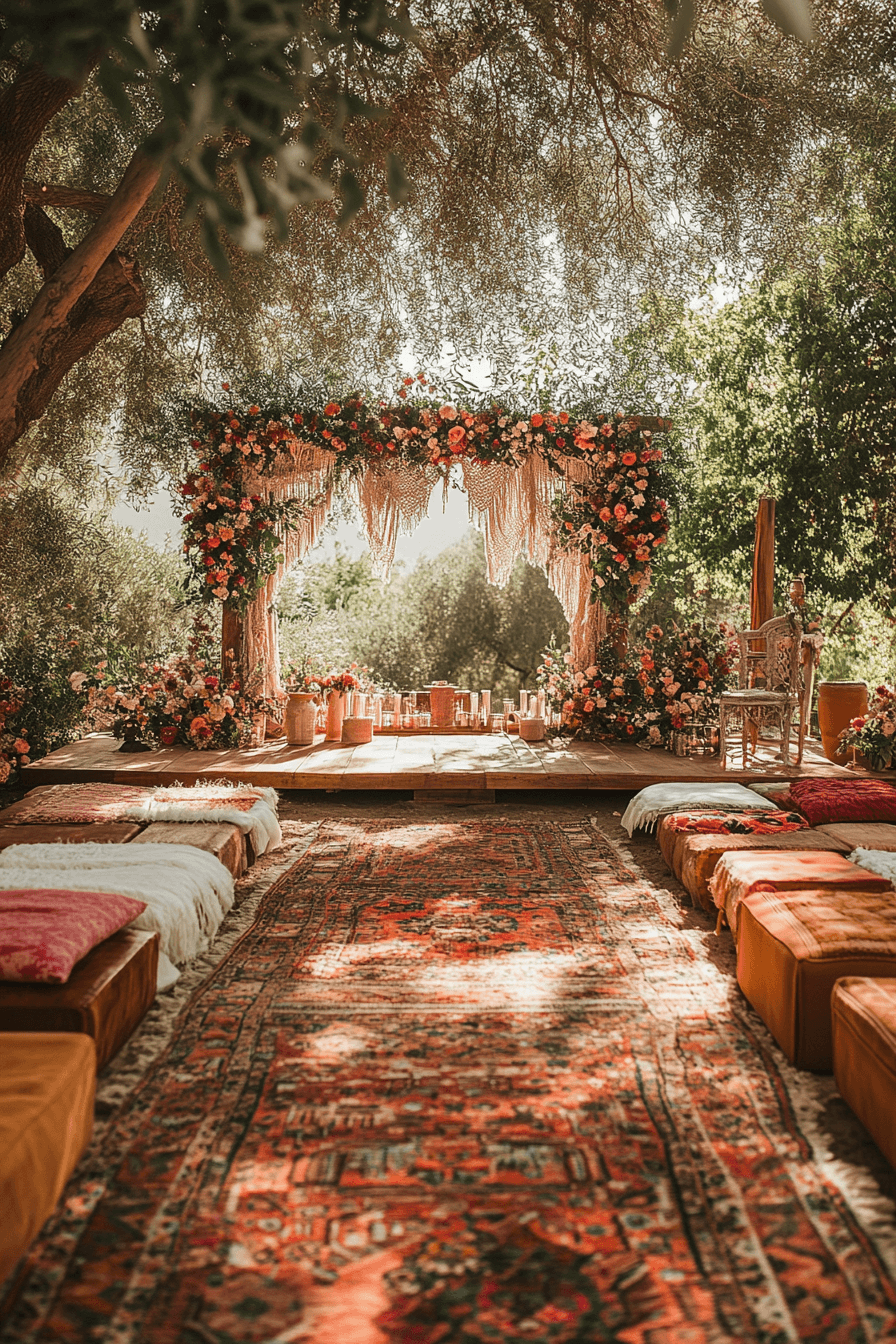 A relaxed bohemian vibe brings warmth and personality into small wedding ideas, creating a celebration that feels free-spirited and full of charm. Layered textiles, colorful rugs, and flowing fabrics instantly set a cozy and inviting tone. Mixing textures like macramé, wood, and soft florals adds depth while keeping the look effortlessly styled. This theme works beautifully in outdoor settings like gardens, deserts, or backyards with natural surroundings. Personal touches like handmade decor or mismatched seating make the experience feel even more intimate. Tap to explore more small wedding ideas with bohemian flair.