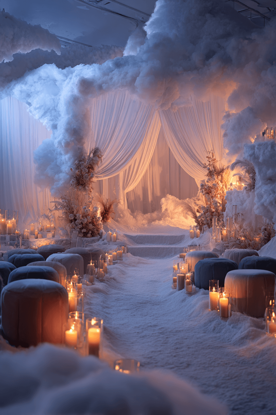 Soft snow-inspired details and glowing lights can turn small wedding ideas into a magical winter escape that feels cozy and enchanting. Think sparkling accents, faux snow textures, and layered fabrics like velvet or faux fur to keep everything warm and inviting. Indoor venues work perfectly for controlling the atmosphere while still capturing that dreamy winter vibe. Candles and warm lighting add a soft glow that makes the space feel intimate and romantic. Seasonal touches like pine greenery or icy blue tones elevate the overall aesthetic beautifully. Click to explore more small wedding ideas inspired by a winter wonderland.