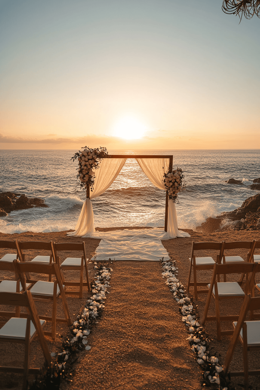 A beachfront ceremony transforms small wedding ideas into a serene and unforgettable experience surrounded by nature. Soft sand underfoot, gentle ocean waves, and a glowing sunset create a naturally stunning backdrop. Keeping decor minimal with neutral tones and subtle coastal accents allows the scenery to shine. Light fabrics, simple arches, and breezy florals enhance the relaxed elegance of the setting. The atmosphere feels peaceful, romantic, and effortlessly beautiful. Click for more small wedding ideas inspired by dreamy seaside moments.