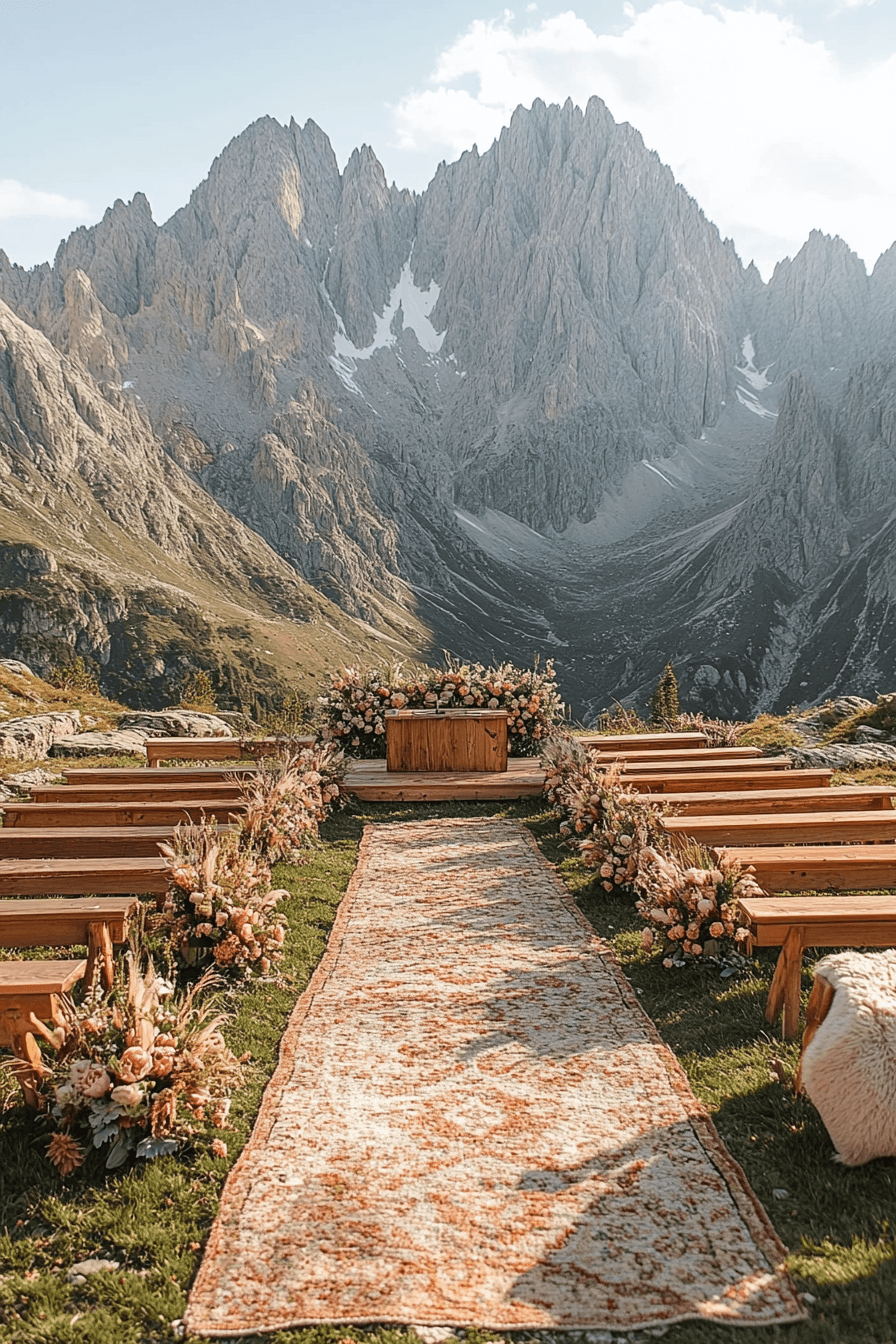 A mountain setting transforms small wedding ideas into a breathtaking and peaceful escape surrounded by nature. Towering views, crisp air, and rustic elements create a stunning yet intimate atmosphere. Wooden details, cozy blankets, and soft lighting add warmth while blending seamlessly with the landscape. This style is perfect for couples who want a balance of adventure and romance. The natural scenery does most of the decorating for you, making everything feel effortless. Click to discover more small wedding ideas with an alpine touch.
