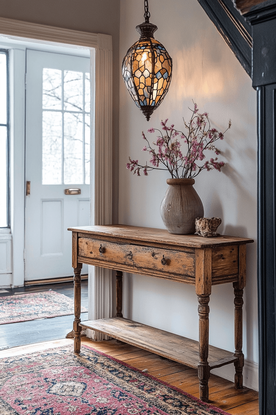 Vintage charm brings warmth and character into your tiny apartment entryway with pieces that feel timeless and full of story. Antique-inspired hooks and a classic wooden bench add both functionality and nostalgic appeal. Subtle decor like old maps or heirloom accents create depth without crowding the space. The overall look feels cozy, lived-in, and effortlessly inviting. Each detail adds personality while maintaining a balanced and practical layout. This design proves small spaces can still feel rich in charm and history. Tap to infuse your entry with vintage soul.
