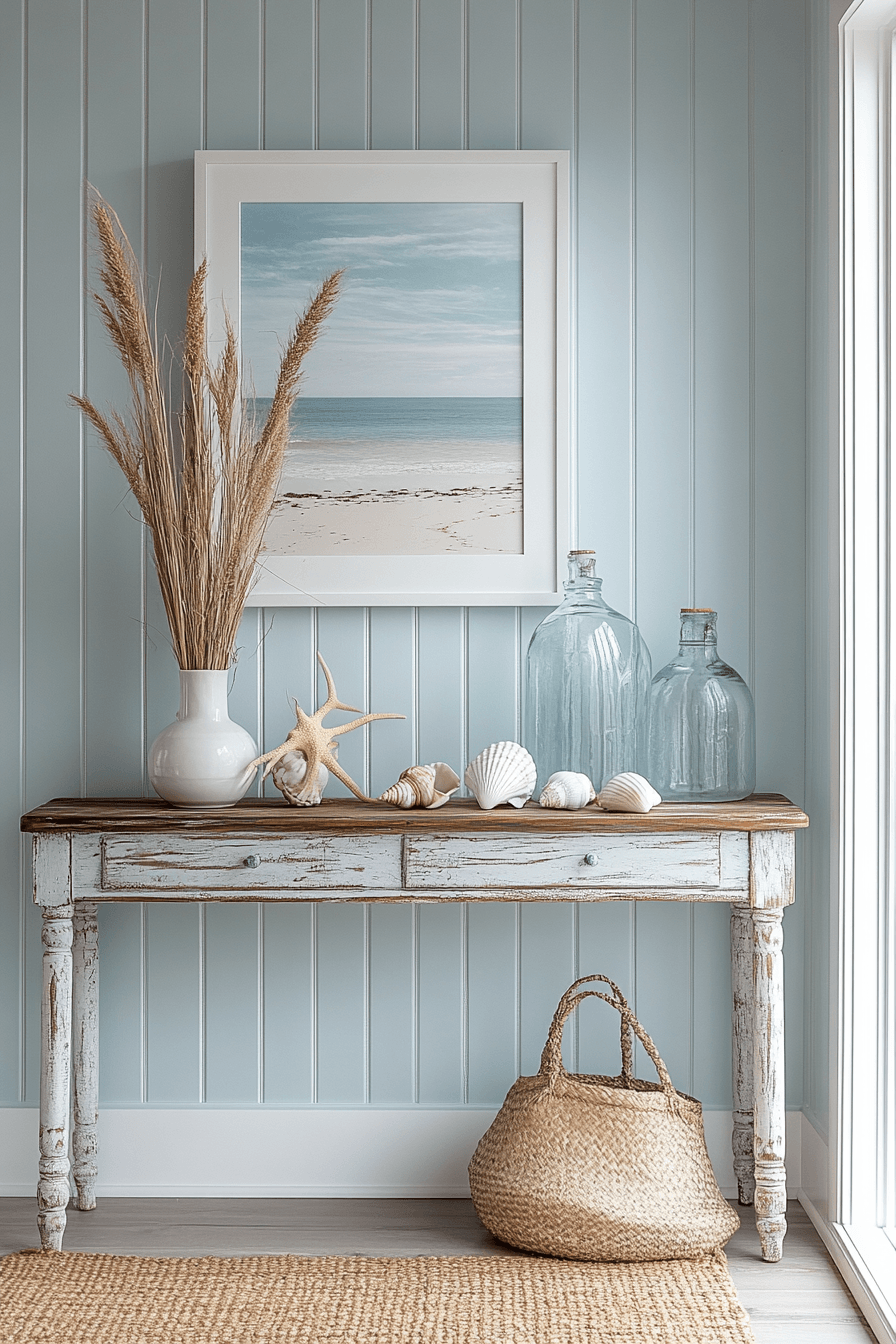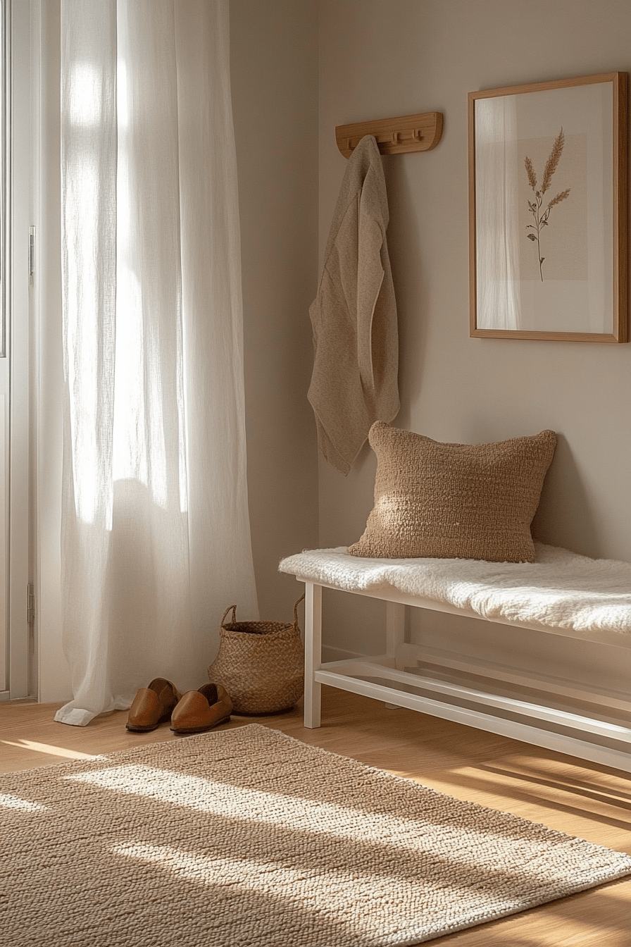 Bring a fresh, seaside-inspired vibe into your tiny apartment entryway with light colors and natural textures that instantly relax the mood. Soft shades of blue, sandy neutrals, and weathered wood accents create that effortless coastal feel. A woven jute rug underfoot and charming hooks add both function and personality. The space feels airy, calm, and welcoming from the moment you step inside. This look works beautifully for anyone craving a peaceful, beachy escape at home. It’s a simple way to make everyday moments feel like a getaway. Explore how to infuse coastal calm into your entry today.