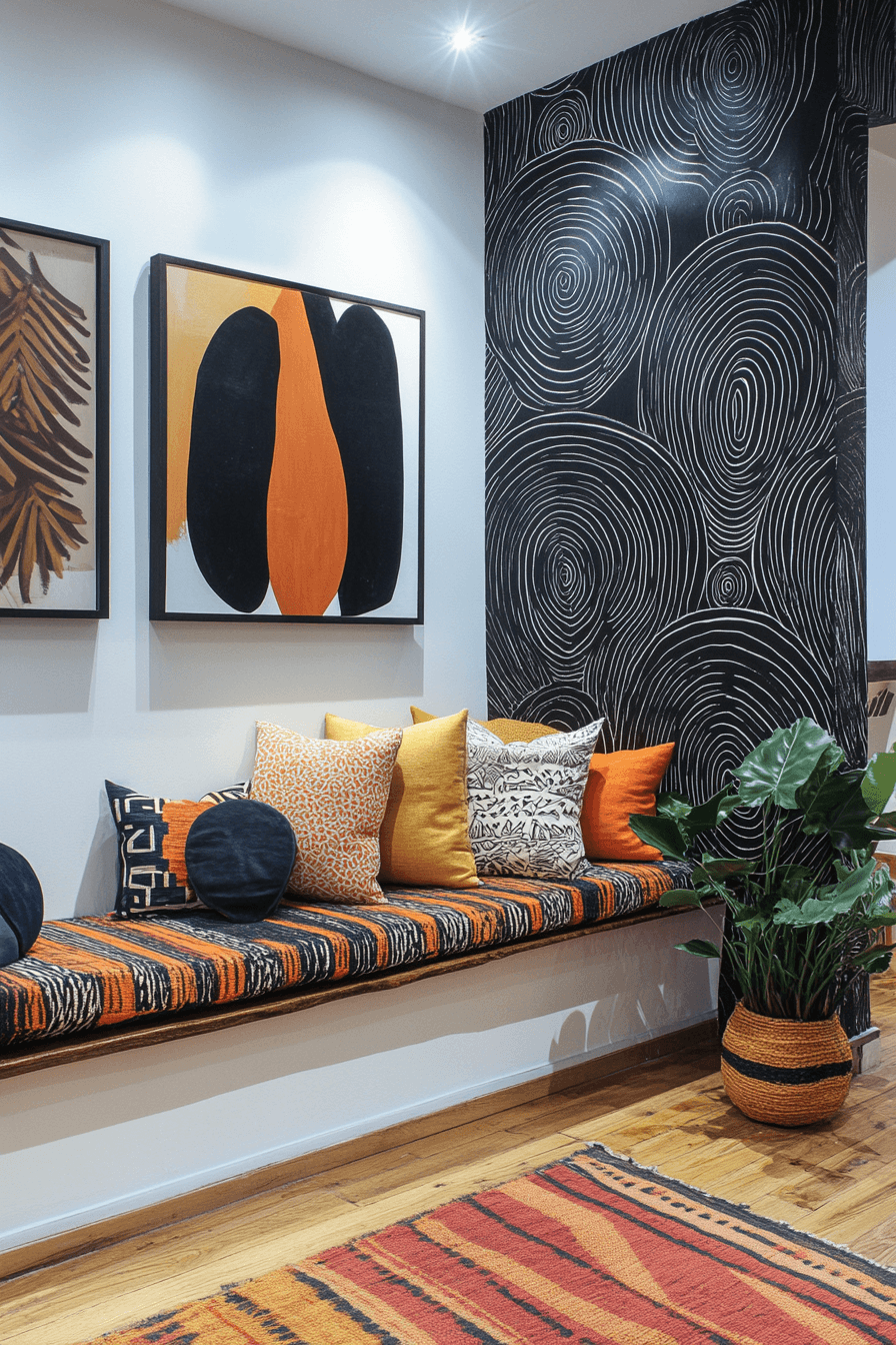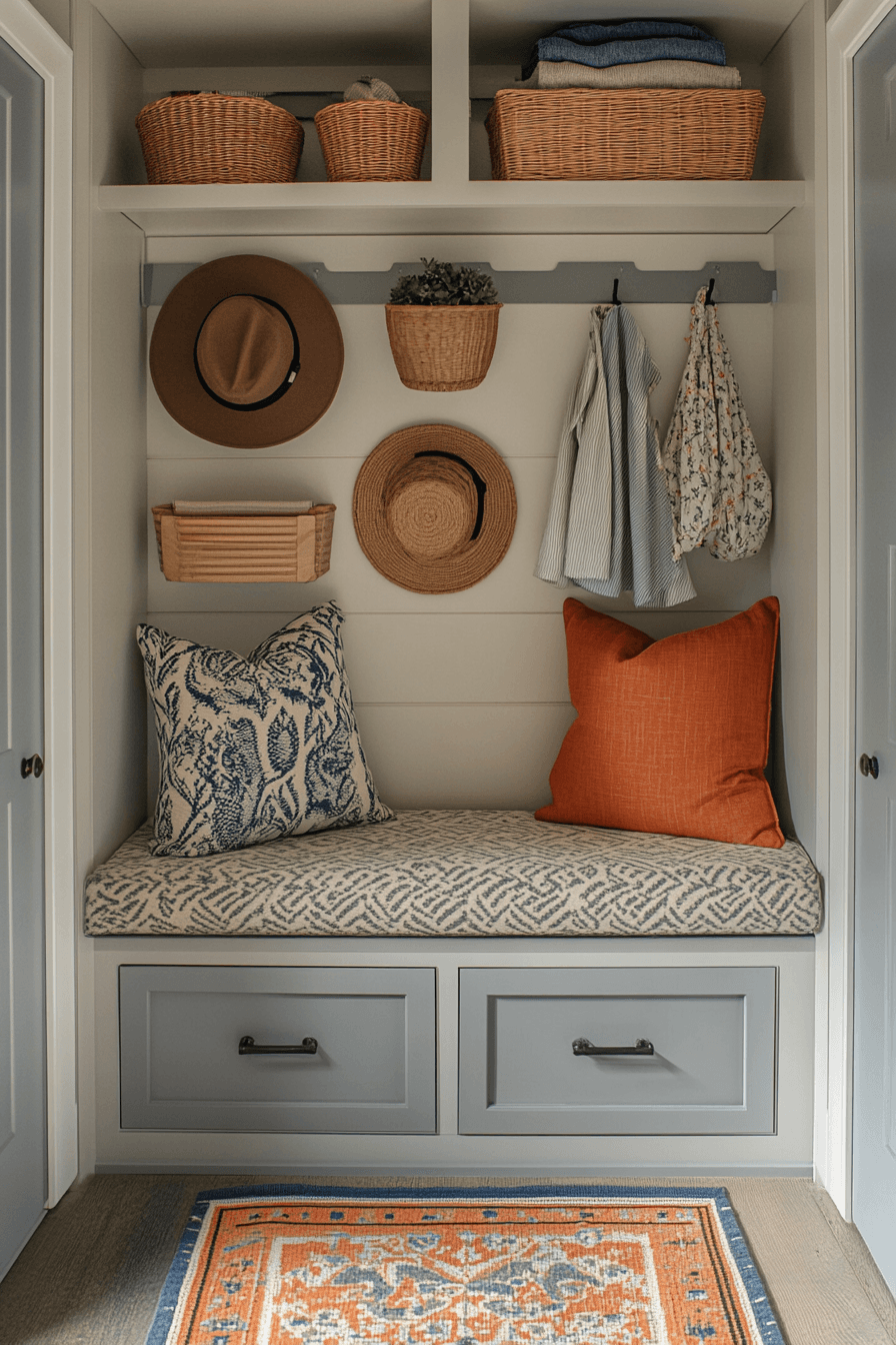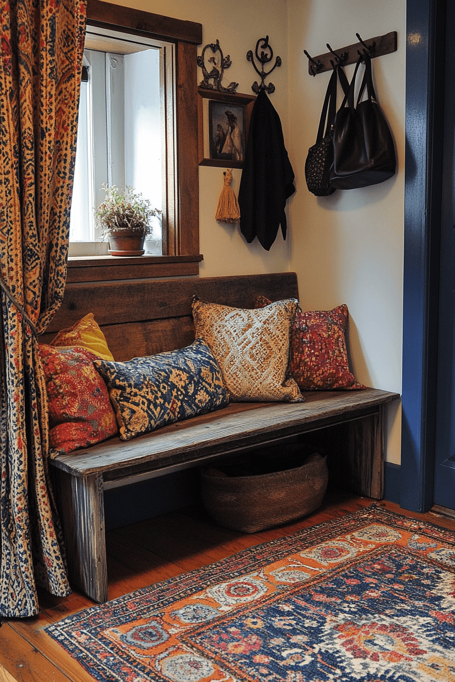 Bring a relaxed and artistic vibe into your tiny apartment entryway with boho-inspired layers full of texture and personality. Woven baskets, rattan details, and vibrant rugs instantly add warmth and visual interest. Decorative hooks showcase accessories like hats and scarves while doubling as stylish accents. A mirror framed in natural materials adds both function and charm. The space feels creative, welcoming, and effortlessly lived-in. This look is perfect for anyone who loves a free-spirited and cozy aesthetic. Explore how to create your own boho-inspired entry.