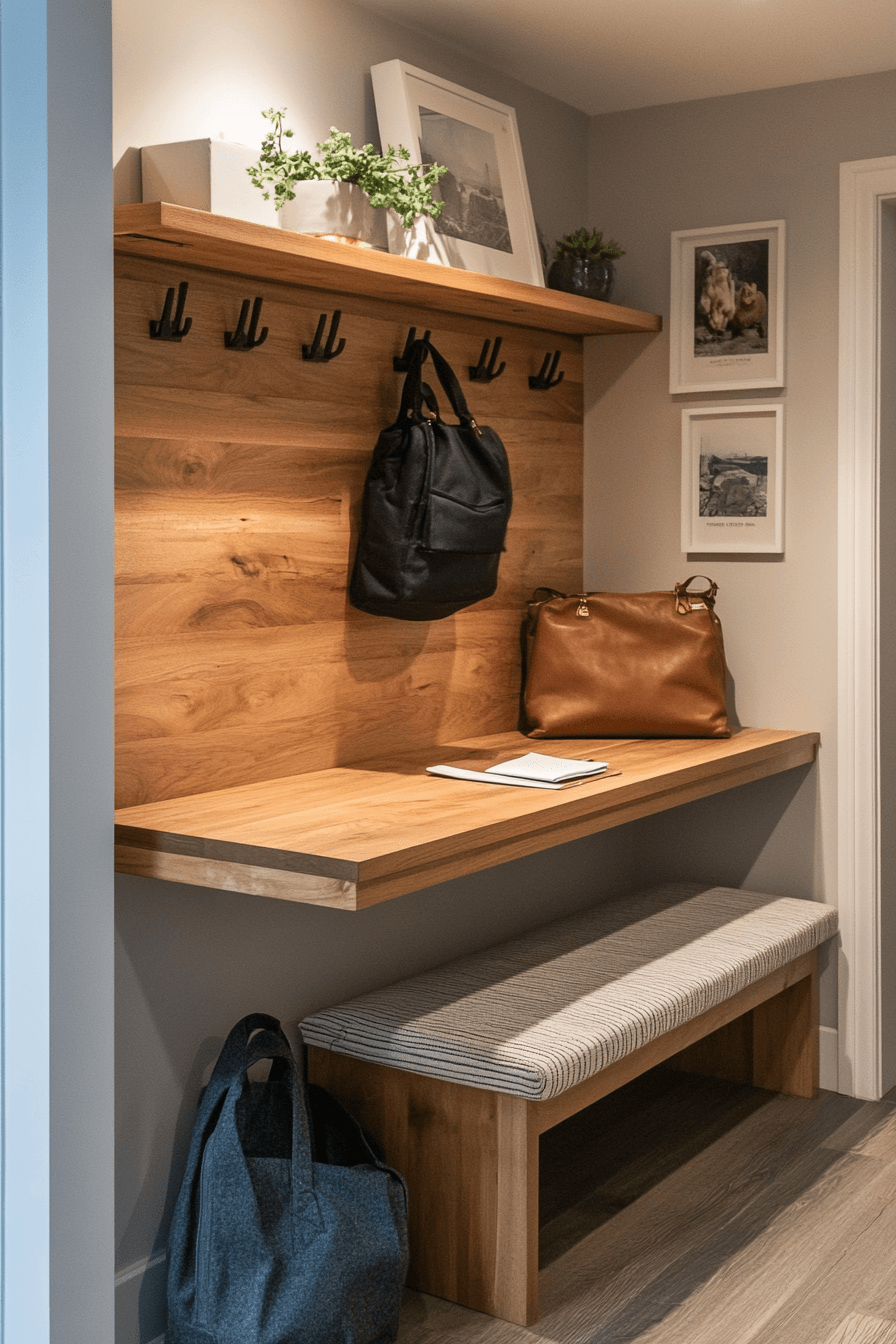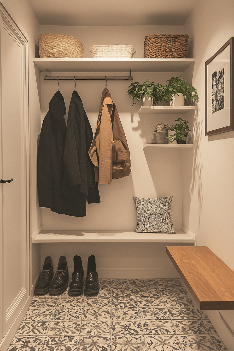 A smart storage system transforms a tiny apartment entryway into an organized and efficient hub for daily life. Built-in cubbies keep accessories like hats, bags, and scarves neatly separated and easy to grab. Elevated storage solutions open up the floor area, making the space feel lighter and more spacious. A few well-placed hooks provide quick access for coats and everyday essentials. The entire setup is designed to streamline your routine while keeping clutter out of sight. This design works because organization instantly enhances both style and functionality. Click to unlock more space-saving storage ideas.