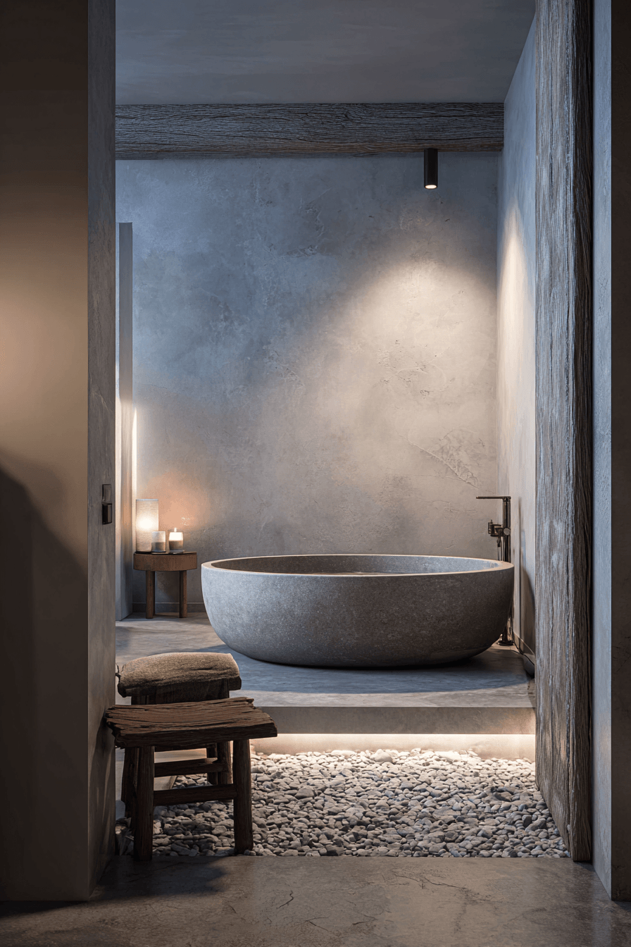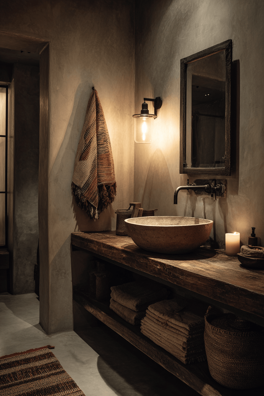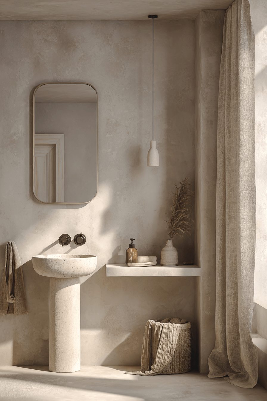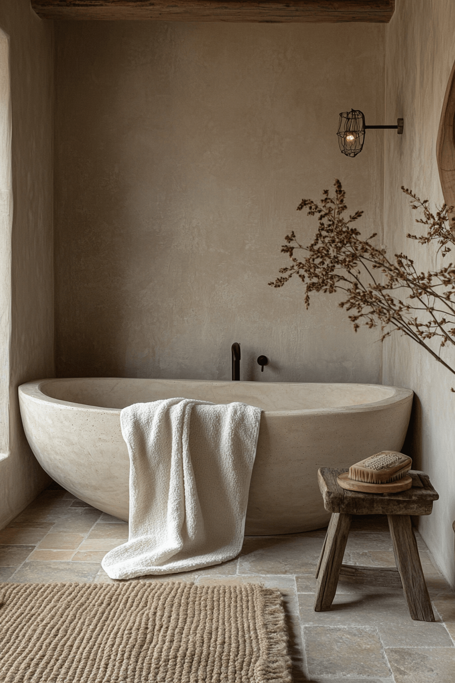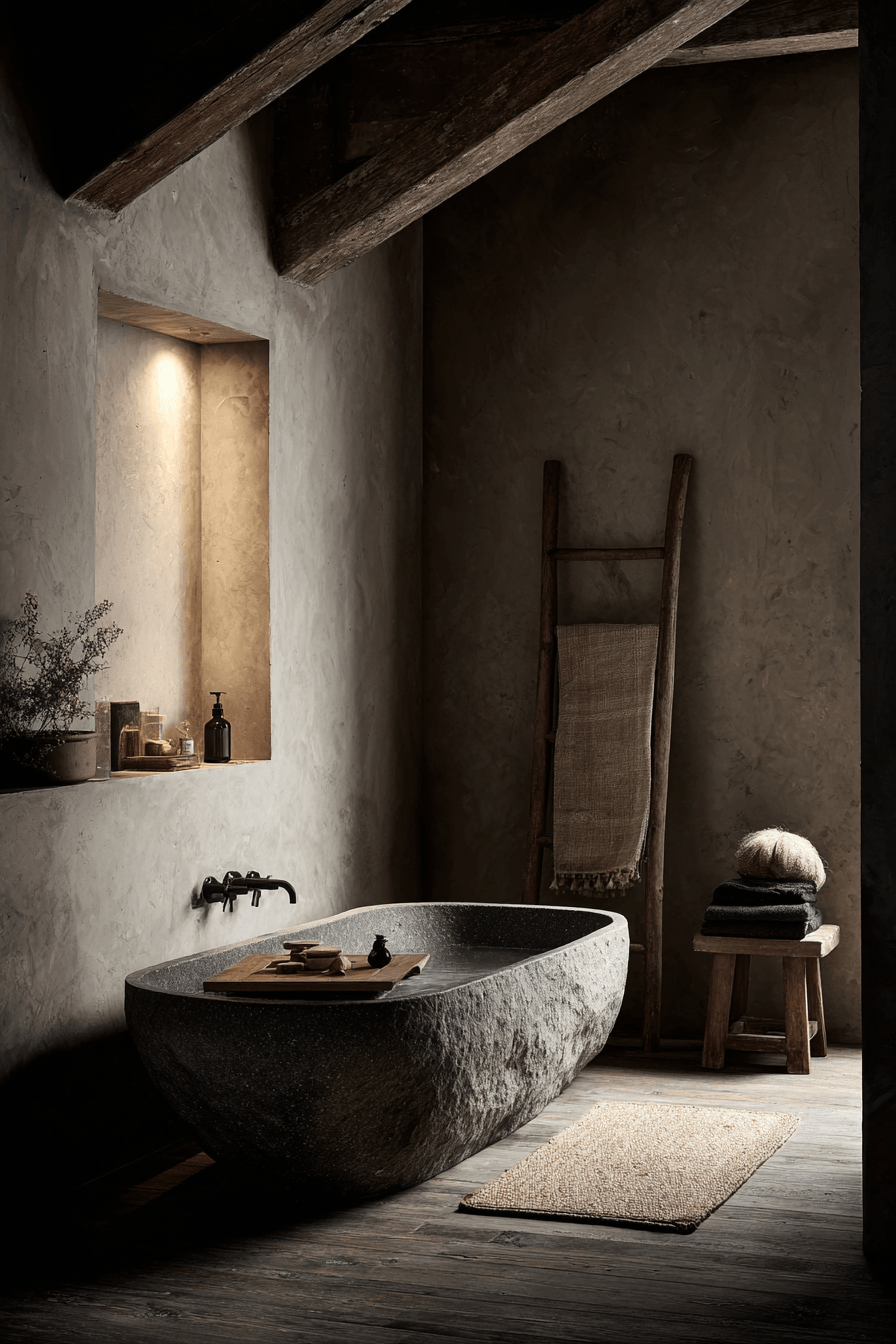 Subtle details take center stage in a wabi sabi bathroom that proves simplicity can be incredibly beautiful. Minimal decor and quiet design choices work together to create a balanced, calming space that feels effortlessly refined. Small touches like a stone dish or a simple wooden stool add charm without overwhelming the room. Soft lighting and muted tones keep everything feeling peaceful and cohesive. It’s all about appreciating the little things that make a space feel complete. Take a moment to explore more quietly elegant bathroom ideas.