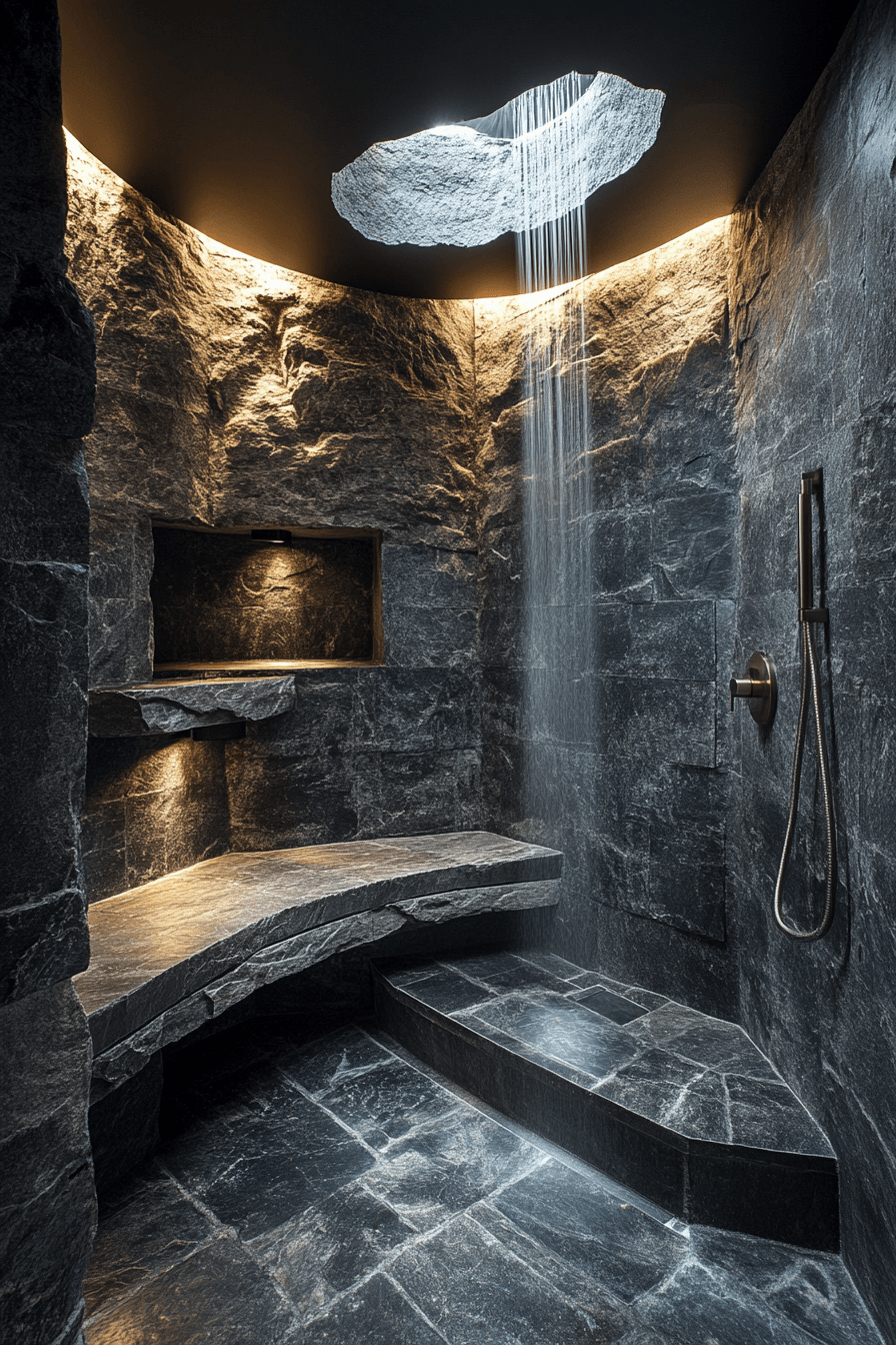 Lighting becomes an art form in a wabi sabi bathroom that plays with soft shadows and gentle illumination. Diffused light filters across textured surfaces, creating depth and a calming visual rhythm throughout the space. Features like a soaking tub or rainfall shower enhance the spa-like atmosphere even more. As the light shifts throughout the day, the room feels alive and ever-changing. It’s a soothing environment designed for total relaxation. Step into more ideas that use light to transform your bathroom.