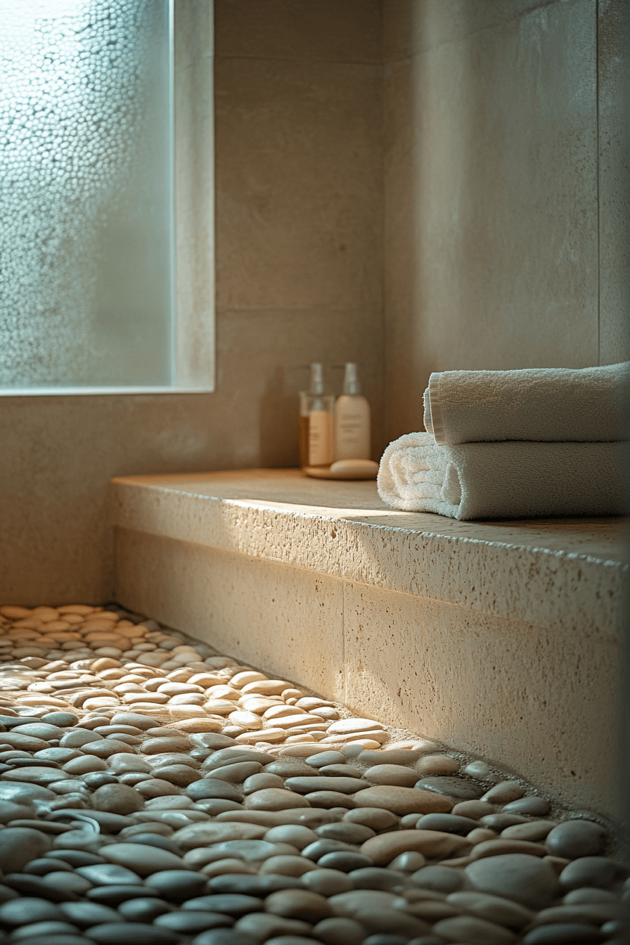 A mix of tactile elements brings warmth and comfort to a wabi sabi bathroom that feels effortlessly inviting. Pebbled flooring, soft linen accents, and brushed finishes create a layered, sensory experience. The textures add interest while maintaining a soft, neutral aesthetic. Natural light enhances the overall calm and cozy atmosphere. It’s a space designed to be both beautiful and relaxing. Explore how to add more texture to your bathroom design.