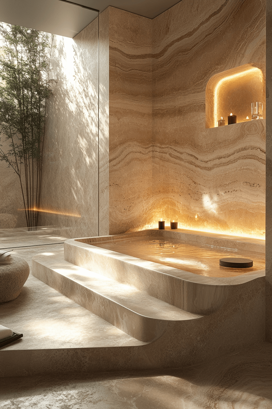 Grounded and calming, a wabi sabi bathroom centered around natural stone creates a strong connection to the earth. From smooth marble surfaces to rugged slate details, each element brings unique character and depth. The natural veining and tones become the focal point of the design. Minimal decor allows the materials to truly stand out. Warm lighting enhances the richness of every surface. See how to design a stone-inspired sanctuary in your home.