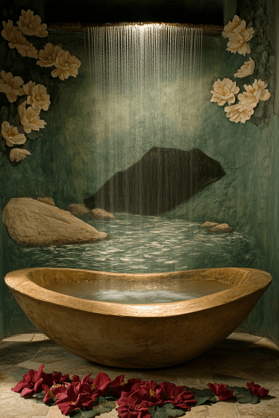 Gentle water elements can completely transform a wabi sabi bathroom into a calming, sensory escape. Features like a small indoor fountain, a cascading wall detail, or a deep soaking tub create a soothing soundtrack that melts away stress. Clean lines and neutral tones keep the focus on the movement and reflection of water. Natural light enhances the shimmer and softness, making the space feel alive yet peaceful. It’s a design that invites you to slow down and unwind. Dive into more ideas that bring tranquil water features into your bathroom.