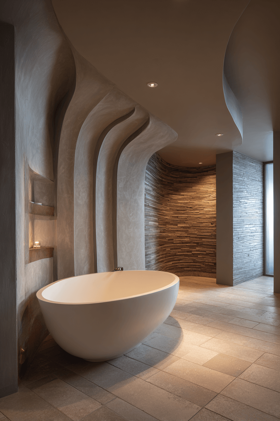 Smooth curves and organic shapes define a wabi sabi bathroom that feels effortlessly fluid and graceful. Rounded fixtures, soft edges, and seamless transitions mimic the natural flow of water throughout the space. This approach removes harsh lines, replacing them with a calming sense of movement. Subtle lighting enhances every curve, adding warmth and elegance without overpowering the design. The result is a bathroom that feels soft, balanced, and beautifully cohesive. Explore how flowing forms can reshape your bathroom style.