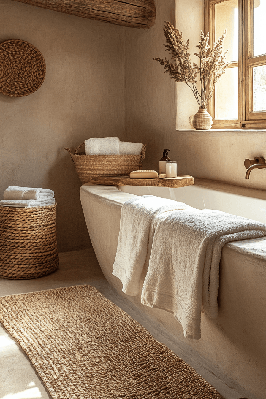Soft textures and natural fibers bring warmth into a wabi sabi bathroom, making it feel instantly more inviting and cozy. Woven elements like rattan baskets, textured mats, and handwoven towels add depth and comfort to the space. These tactile details create a sense of ease while still maintaining a clean, minimal look. Earthy tones keep everything grounded and connected to nature. It’s a simple way to make your bathroom feel warm and lived-in. Get inspired to layer in texture for a more welcoming space.